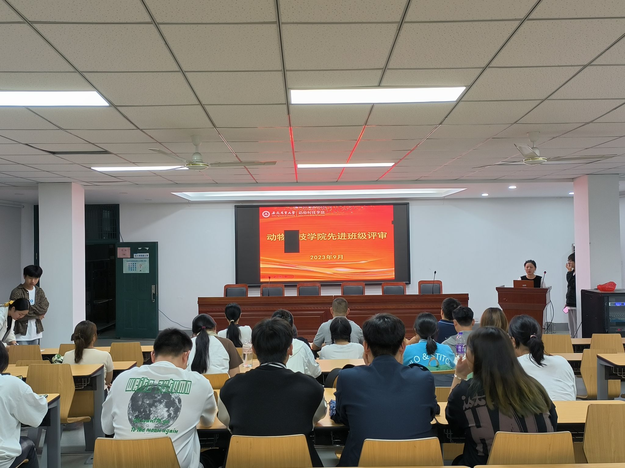 此次会议分为主持开场、各班级代表上台竞选、评委提问、统计各班总得分四个主要环节。首先,由主持老师向大家介绍评定规则,从思想政治、班风学风建设、日常管理、班级活动和本学年获得的各项荣誉奖励五大方面,细化各项参评条件、细分准则和注意事项。接下来,由各班代表上台答辩,他们分别是:20动物医学3班、21动物医学1班、21动物医学2班、22动物科学专升本1班、22动物科学专升本2班。各班答辩代表从专业角度出发,向评委列举班级在学业、生活、就业各方面取得的成就,摆事实讲道理,有力阐释了各班管理和思想的先进性和团结性。会议最后,评委根据各班介绍和提问环节的回答评分,汇总得出了本次先进班级的最终结果。