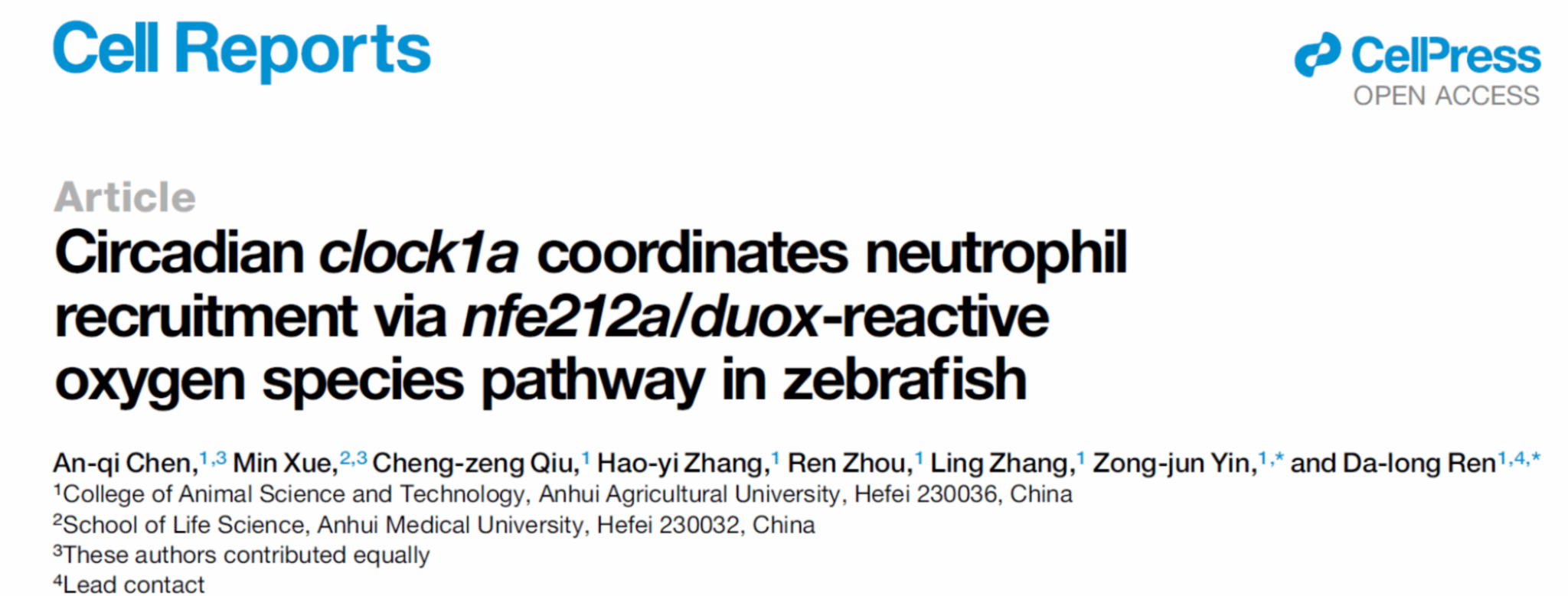 本网讯 近日,公司yl1111永利集团任大龙教授课题组在《Cell Reports》期刊发表了题为“Circadian clock1a coordinates neutrophil recruitment via nfe212a/duox reactive oxygen species pathway in zebrafish”的文章。