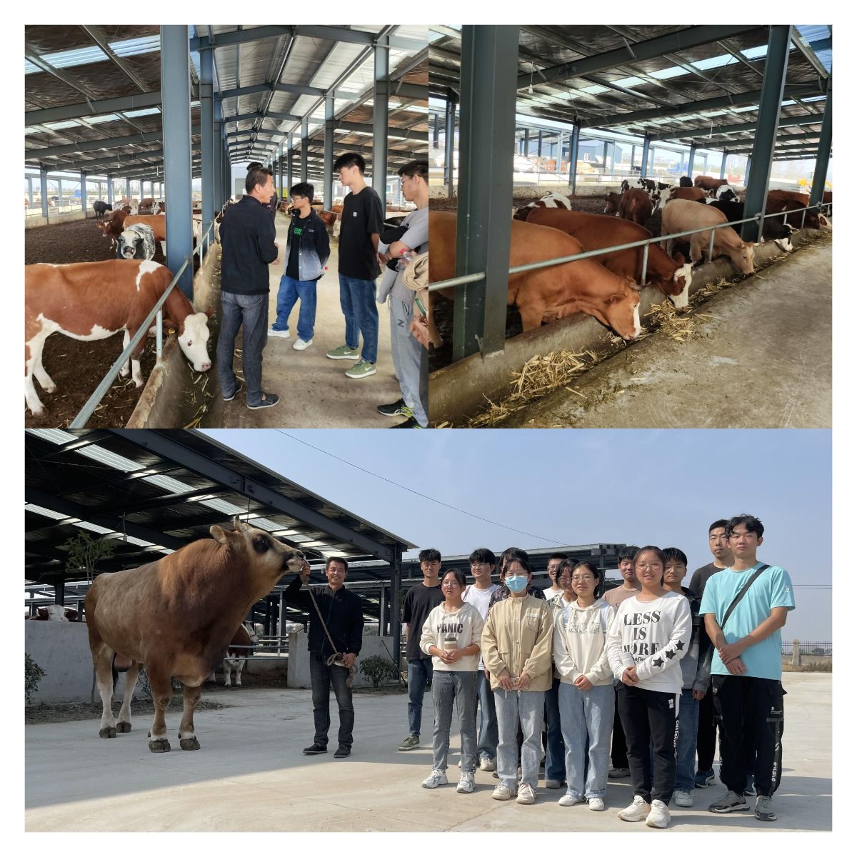 实践创新团队还在老师们的带领下前往中原牧业第四牧场、恒丰牧业、安徽天缘牧业有限公司进行学习参观。实地了解牛场、羊场的基本情况,近距离接触安徽省首个、全国第四个成功培育的肉用山羊新品种皖临白山羊,通过实地参观和书本上知识进行对比,使员工们对于理论学习有了更深入的了解。