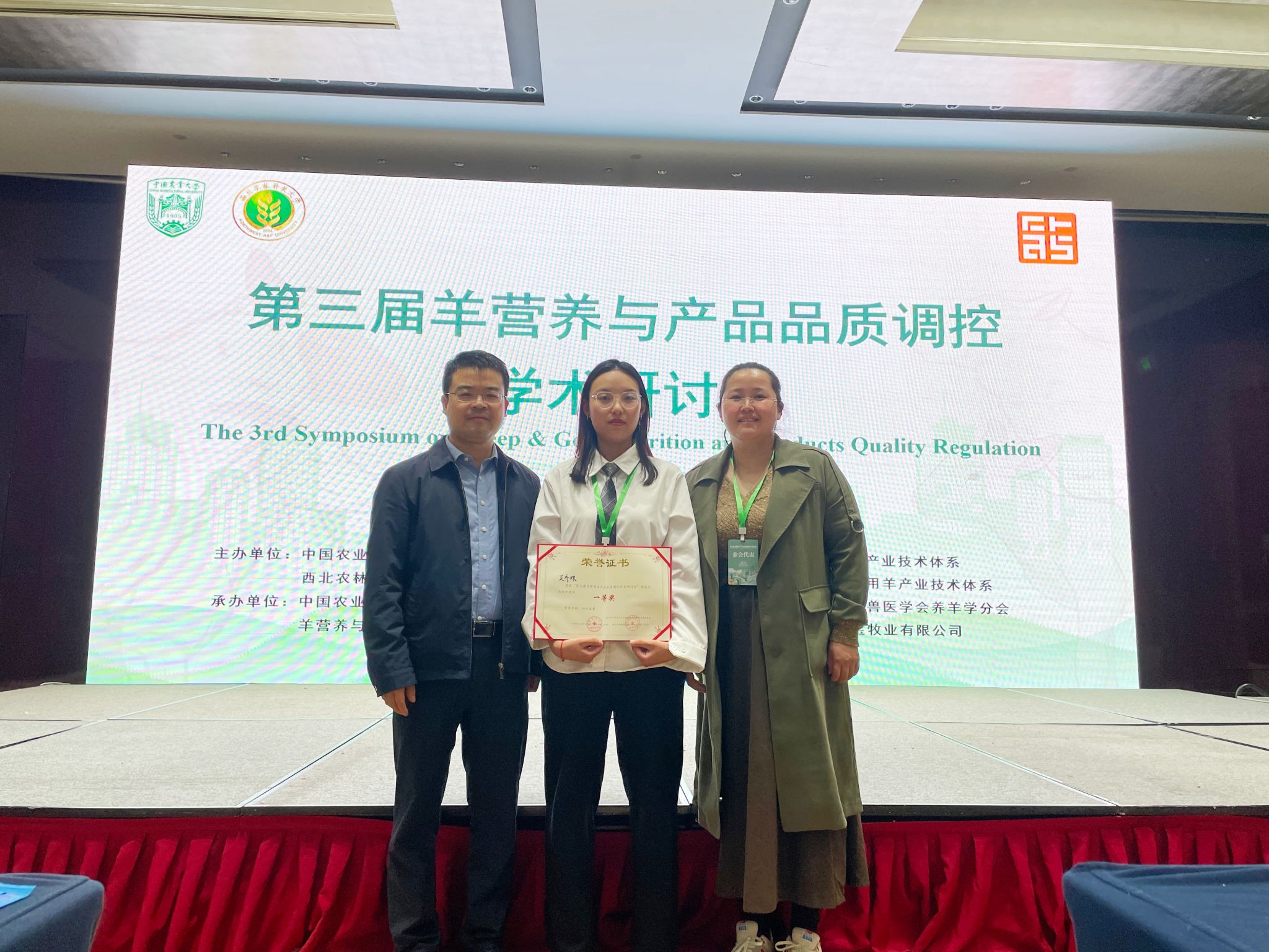 本网讯 11月4日,由中国农业大学和西北农林科技大学主办的第三届羊营养与产品品质调控学术研讨会在北京举办。yl1111永利集团副经理凌英会教授和李爽教师带领22级畜牧专业研究生吴乔珠参加此次学术研讨会研究生论坛。经过精彩汇报和激烈角逐,吴乔珠在研究生论坛中获得一等奖的优异成绩。