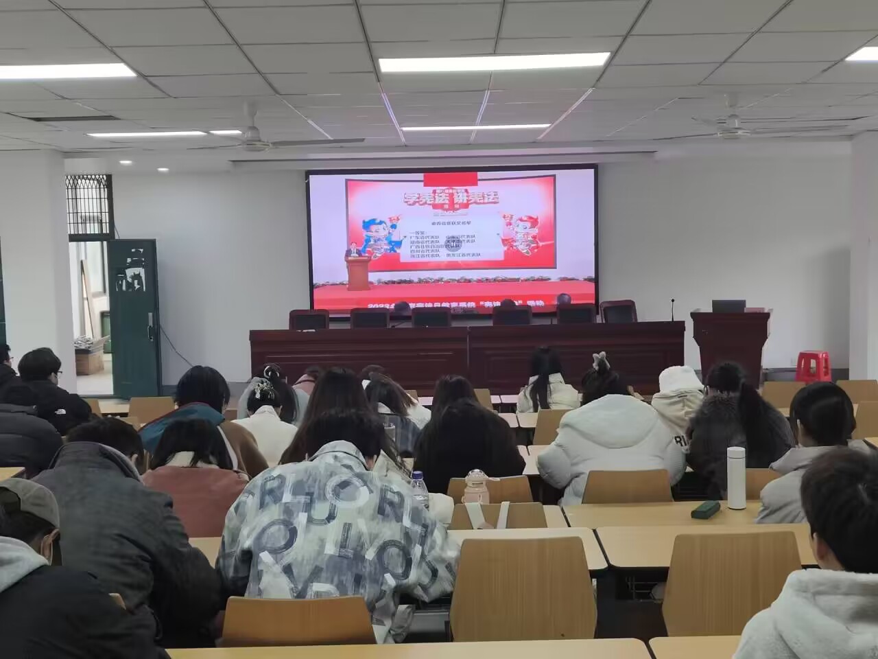 活动在升旗仪式中拉开了帷幕,此次活动中,同学们跟读了宪法部分条款,主会场领唱了《宪法伴我们成长》歌曲,接着一起观看了“第八届全国员工‘学宪法讲宪法’活动全国总决赛演讲比赛优秀选手展演,展演分别由小学、初中、高中、大学四名代表进行发言,进一步强化了同学们的宪法体验,有利于让同学们养成良好的知法、守法的习惯。最后,全国人大常委会法工委领导和教育部领导的讲话,更让同学们了解到全面依法治国的重要意义,感受到宪法在全面依法治国中的重要作用。