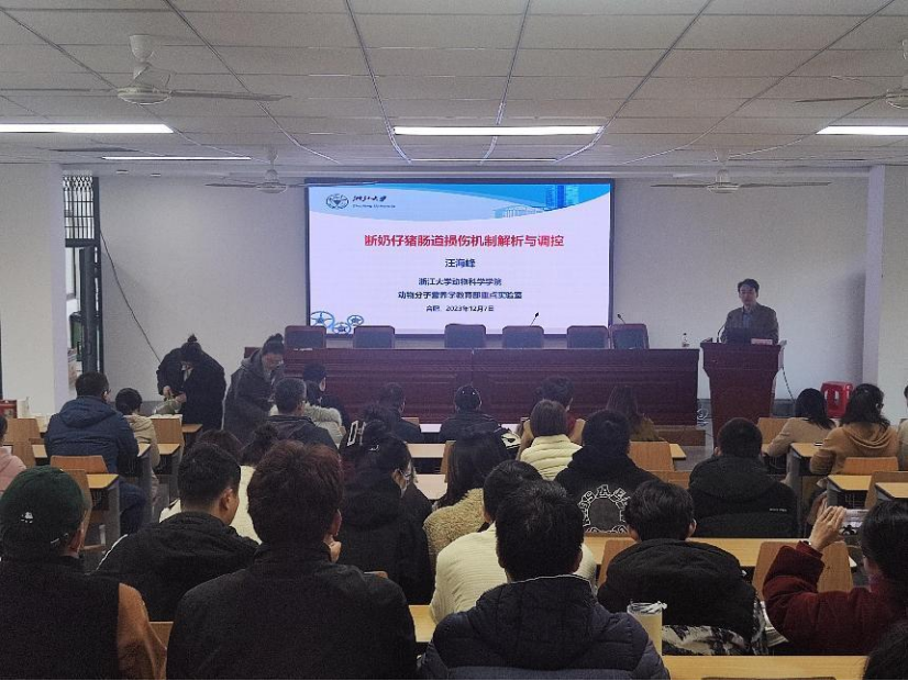 本网讯 12月7日,浙江大学动物科学学院汪海峰研究员应邀来yl1111永利集团作《断奶仔猪肠道损伤机制解析与调控》学术报告。学院青年教师、硕士博士参加报告会,报告会由学院副经理凌英会主持。
