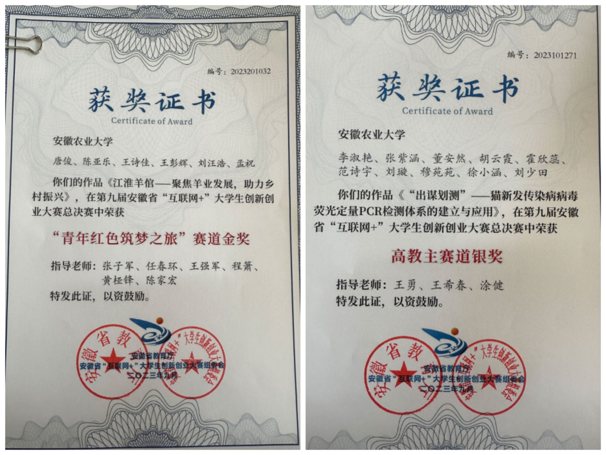 由张子军、任春环、王强军、程箫、黄桠锋、陈家宏老师共同指导的唐俊团队创作作品《江淮羊倌——聚焦羊业发展,助力乡村振兴》在总决赛中获得“青年红色筑梦之旅”赛道金奖的优秀成绩;由教师王勇、王希春和涂健带领的李淑艳主创团队的作品《“出谋划策”——猫新发传染病病毒荧光定量PCR检测体系的建立与应用》在总决赛中荣获高教主赛道银奖。