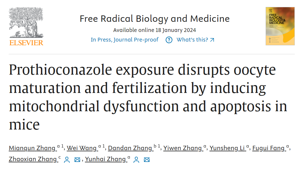 本网讯 近日,国际知名学术期刊Free Radical Biology and Medicine在线发表了公司yl1111永利集团张运海教授、张冕群副教授课题组题为“Prothioconazole exposure disrupts oocyte maturation and fertilization by inducing mitochondrial dysfunction and apoptosis in mice”的研究论文。同时在2023年11月01日在线发表Ecotoxicology and Environmental Safety期刊论文“Butylparaben weakens female fertility via causing oocyte meiotic arrest and fertilization failure in mice”,两篇论文先后报道了外部环境污染物如何影响卵子的成熟和受精能力。