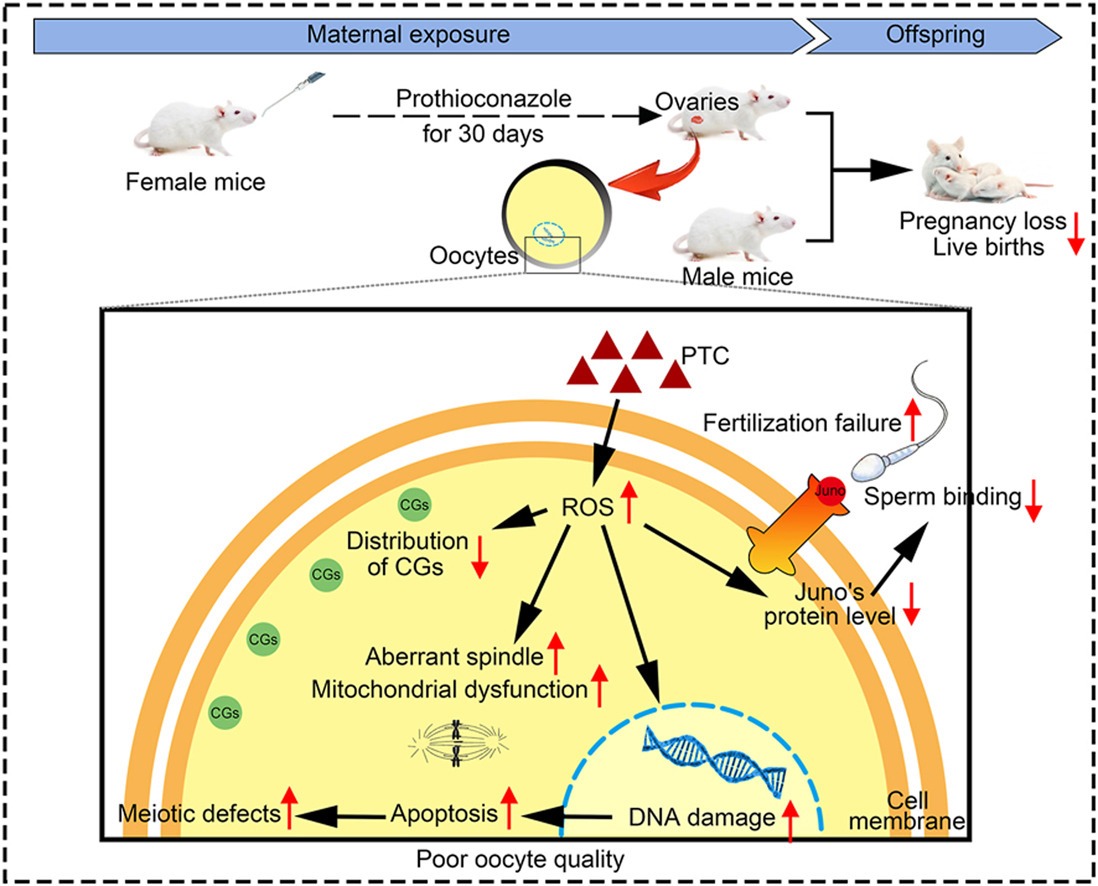 家畜繁殖力低下是目前制约畜牧生产的一个严重问题,由环境因素所造成的卵子质量低下会导致受精失败和早期胚胎发育停滞,被认为是破坏动物繁殖力的关键内在原因之一。该团队研究发现,抗菌剂Butyl-paraben、杀菌剂Prothioconazole会诱导卵子氧化应激水平升高,通过破坏纺锤体组装和染色体排列阻碍卵子成熟,同时引起皮质颗粒提前释放ovastacin,造成精子结合位点ZP2异常切割,来损害卵透明带与精子的结合能力,而且破坏了卵子质膜上负责与精子融合的蛋白Juno的定位和蛋白量,从而导致卵子无法正常受精。利用实验动物开展各种环境因素的生殖毒理研究,解析其对繁殖的毒性作用及机制,有助于建立并优化动物生殖健康保护屏障,保护家畜繁殖力或人类生育力。