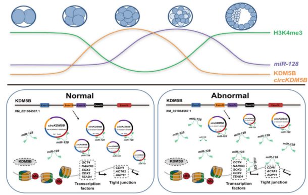 环状RNA(circRNA)是一类在真核生物中广泛存在的非编码RNA分子,因其特殊的环状结构和多样的生物功能而备受关注。在哺乳动物中,circRNA 参与调控精子发生、细胞重编程、干细胞多能性维持等生物学过程。近年来,尽管在小鼠和人类的卵母细胞及早期胚胎中鉴定了大量的 circRNAs,但 circRNA 在卵母细胞成熟以及早期胚胎发育过程中具体的功能和调控机制仍有待阐明。