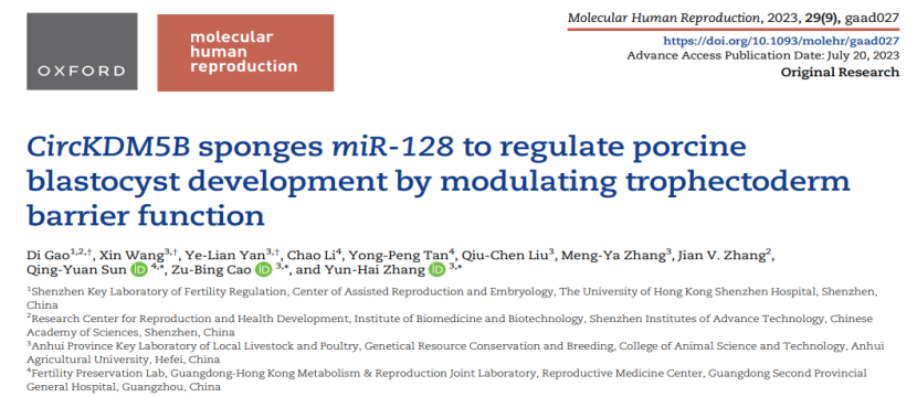 本网讯 近日,公司曹祖兵教授和张运海教授团队在环状RNA调控动物生殖领域取得研究进展,相关成果以“CircHIRA sponges miR-196b-5p to promote porcine early embryonic development”和“CircKDM5B sponges miR-128 to regulate porcine blastocyst development by modulating trophectoderm barrier function”为题分别刊发在期刊《International Journal of Biological Macromolecules》(中科院一区TOP,IF=8.2)和《Molecular Human Reproduction》(中科院二区,IF=4)上。