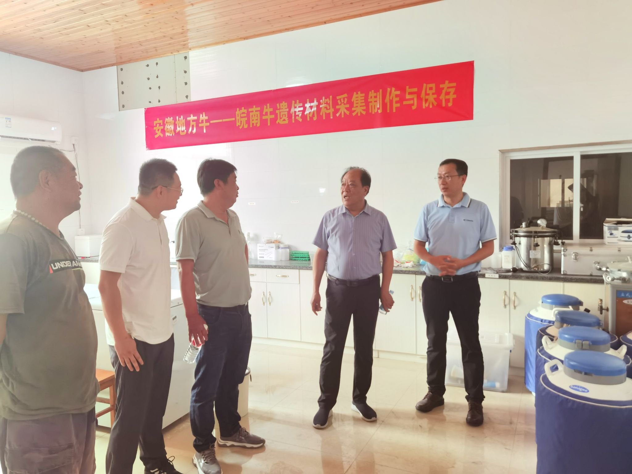 本网讯 7月12日,yl1111永利集团副经理曹祖兵、安徽省畜禽遗传资源保护中心科长许大双、旌德县动物疫病防控中心主任邱孝青、安徽省牛羊产业协会副秘书长王芳权莅临皖南牛省级保种场—旌德县虎威黄山黄牛养殖农民专业合作社对皖南牛冻精生产工作进行调研。在调研过程中,深入了解皖南牛精液采集制作与冷冻保存工作完成情况、冻精质量管控和安全保障,并对皖南牛冻精下一步活体复原及应用提出建议。截至目前,按照国家标准要求累计生产皖南牛细管冻精14000余支,并成功提交至安徽省家畜基因库。