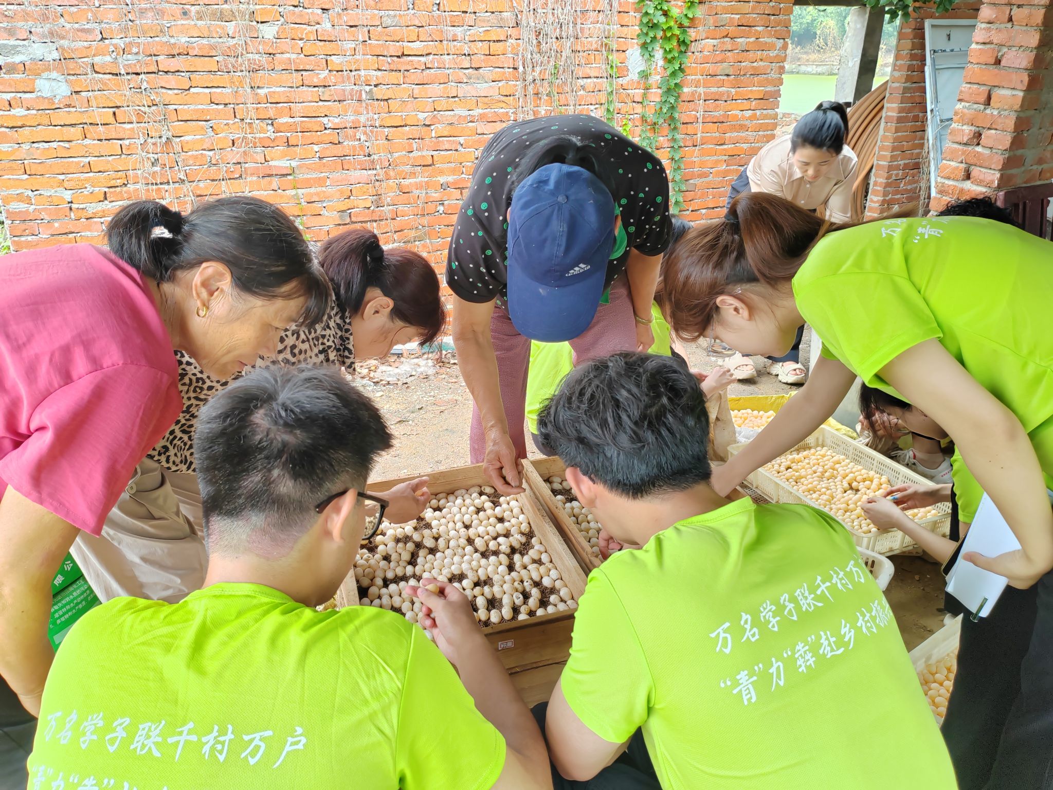 寓“学”于做,实践出真知。揭牌仪式后,实践团在寿县堰口镇综合养殖场开始了实践活动。指导老师张君和合作社负责人带领队员们学习龟鳖繁殖和养殖的各个环节。首先是龟鳖蛋的挑选,这是整个养殖过程的关键环节,重点要把没受精或者破损严重的蛋挑拣出来,防止后续发霉影响其它正常蛋的生长。队员们与当地农户们一起挑拣,在劳动的过程中也学习到正常的受精卵有个明显的白色受精斑,龟蛋不能轻易动,会导致受精蛋停止发育等实际操作知识。