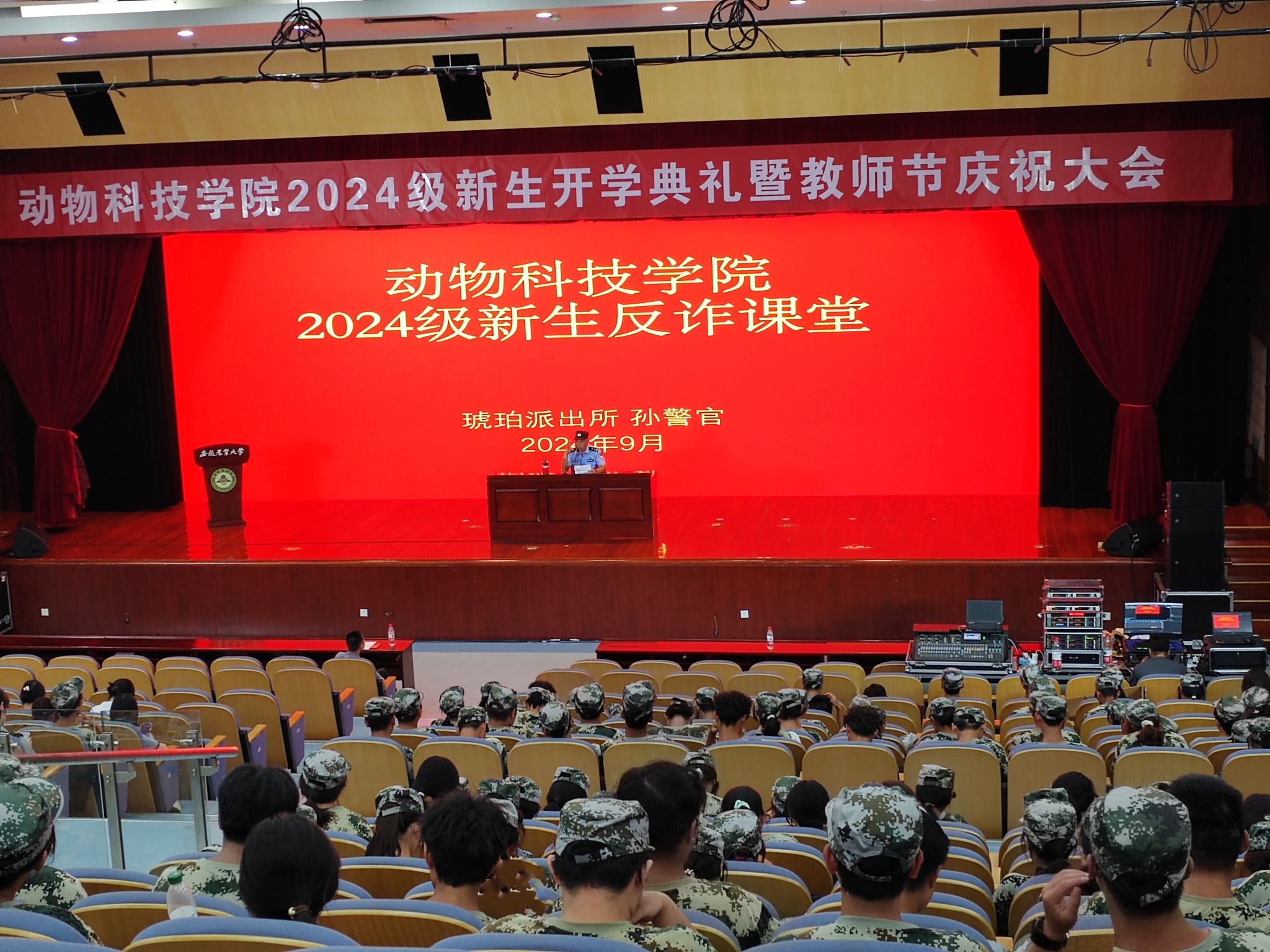 本网讯 9月9日下午,学院在图书馆第一报告厅举办新生反诈教育活动。蜀山区琥珀派出所警官孙健民、公司党委副书记章巍、2024级新生辅导员及全体新生参加本次活动。