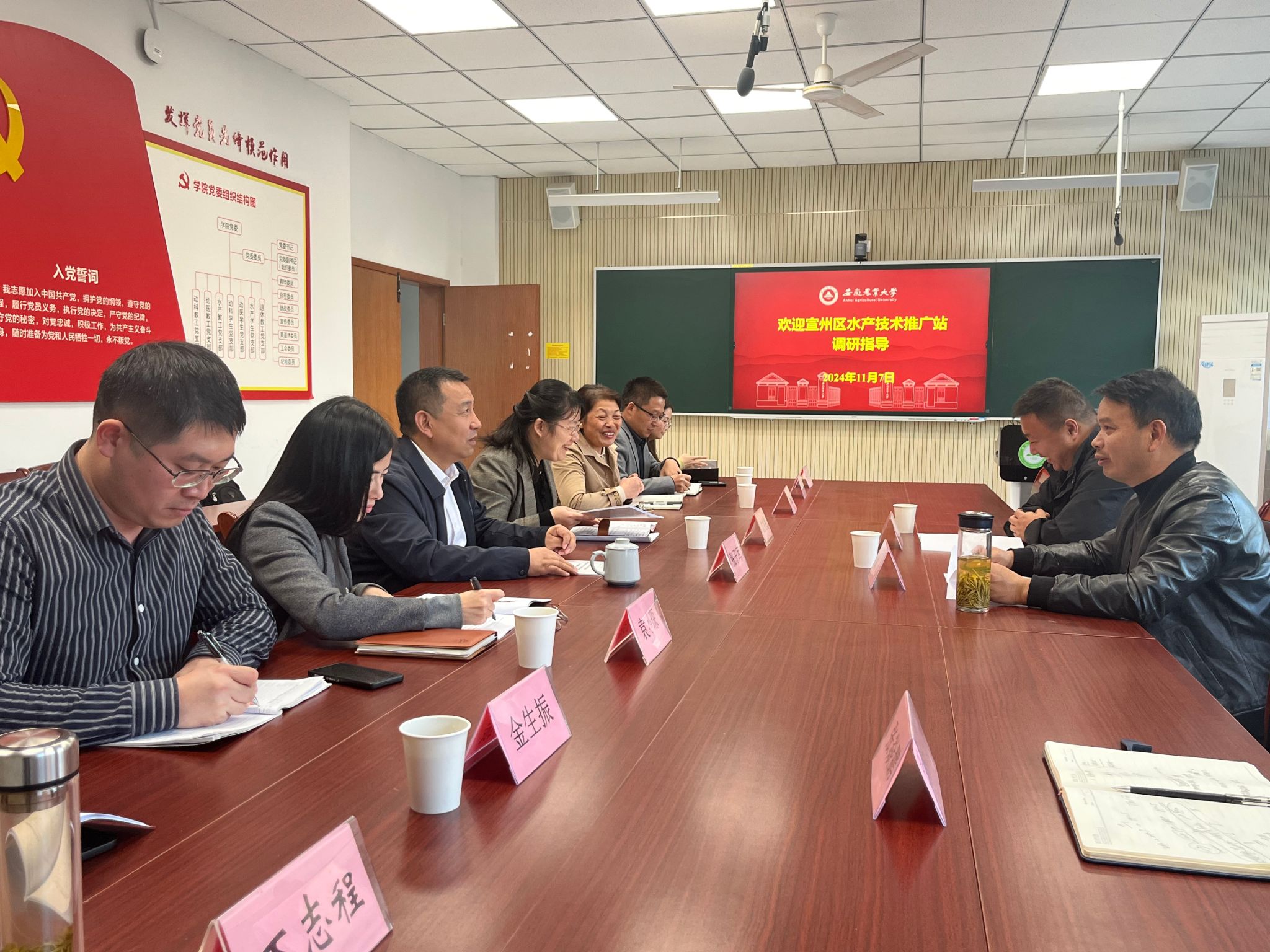 本网讯 11月7日,宣州区水产技术推广站站长沈蓓杰和副站长余护来学院调研交流。公司党委书记沈兆梅、经理张子军、水产系教师丁淑荃、李西雷、袁小琛、金生振等参加了本次调研交流活动。