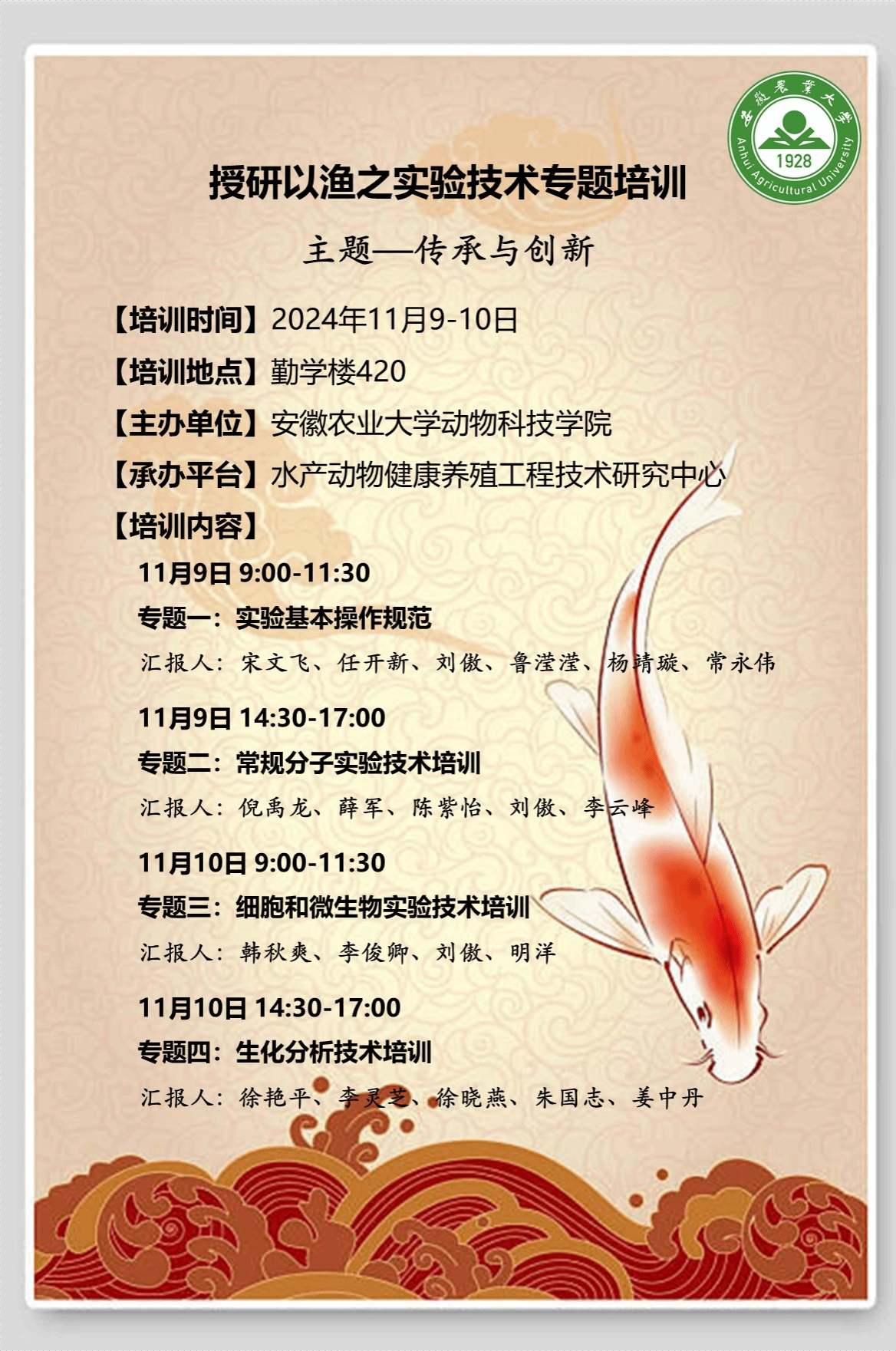 本网讯 为进一步强化党建引领,打造“授人以渔”特色党建品牌,11月9日至11月10日,水产系开展 “授研以渔” 系列之实验技术专题培训活动。该活动由学院主办、水产动物健康养殖工程技术研究中心承办,学院副经理曹祖兵、水产系副主任袁小琛、水产系部分老师以及全体水产系研究生参加此次活动。