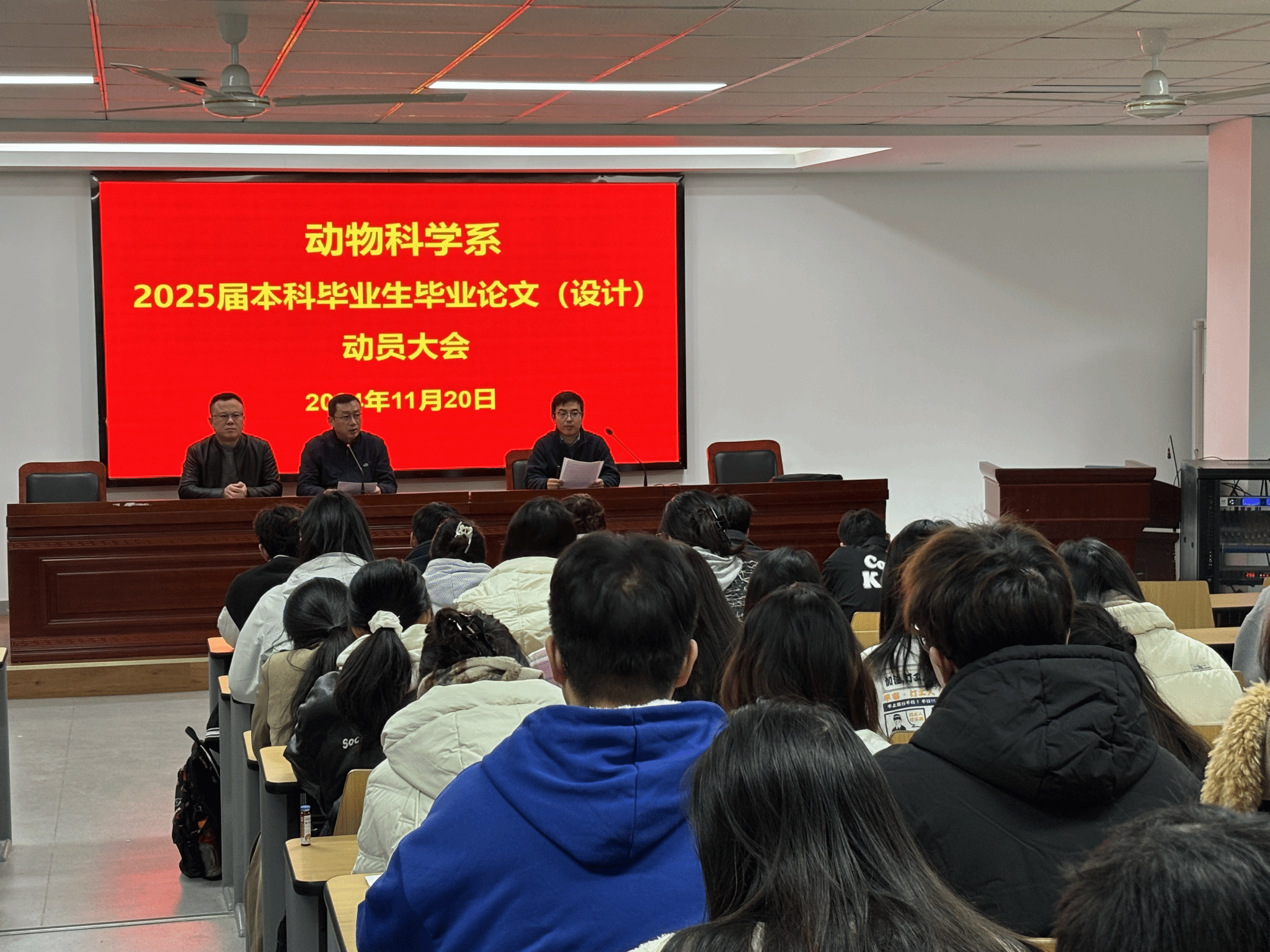 本网讯 11月20日,学院动物科学系2025届本科毕业生毕业论文(设计)动员大会在动科院318会议室顺利召开。本次大会旨在为即将步入毕业论文(设计)阶段的员工提供指导,确保毕业论文(设计)工作的高质量完成。学院副经理曹祖兵、动物科学系主任张成、副系主任王强军及2025届全体本科毕业生参加大会。