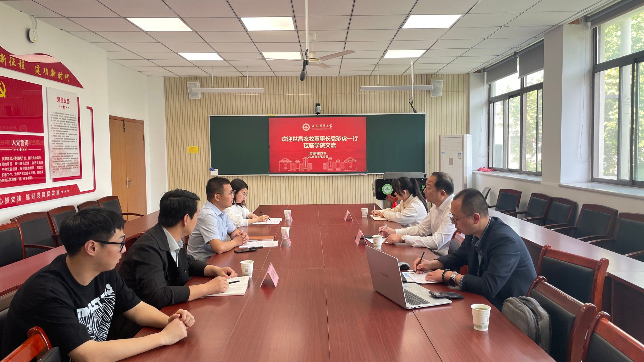 本网讯 4月29日上午,江苏世昌农牧集团股份有限公司董事长袁珍虎、人事经理陈士贵、人事主管严艺一行来公司座谈交流,学院副经理袁小琛、动物营养与饲料科学系副主任薛艳锋等参加座谈会,会议由公司党委副书记卢伟主持。