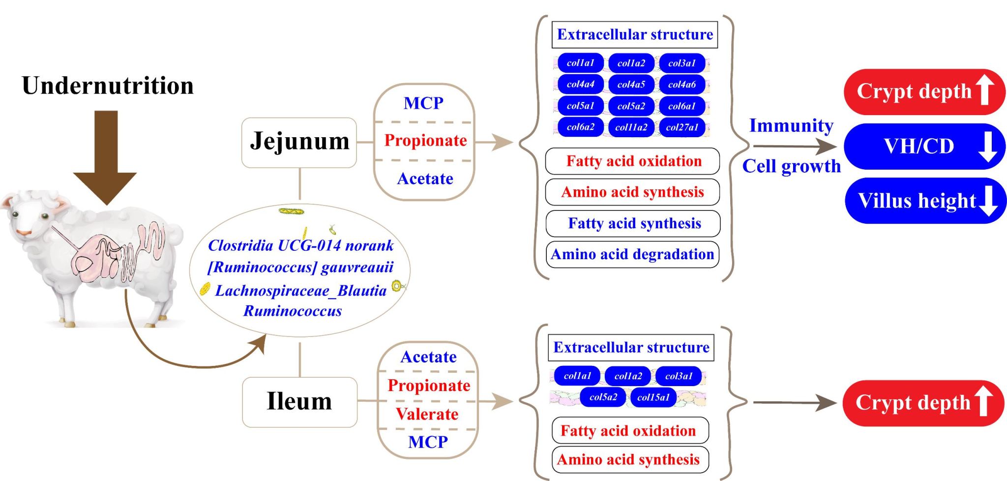 营养不良在妊娠后期母羊中普遍存在,此阶段胎儿快速生长导致营养需求剧增,而母羊因子宫挤压腹腔,采食量下降,极易发生能量负平衡。这不仅威胁母羊健康(如诱发妊娠毒血症),更会严重阻碍胎儿发育,导致弱羔或死胎。小肠是营养物质消化吸收的关键部位,也是抵御病原体的重要屏障,但其在营养不良状态下的微生物-宿主互作机制尚不清楚。该研究结果表明,营养不良破坏了小肠微生物群落结构,减少了挥发性脂肪酸和微生物蛋白的产生,迫使小肠上皮进行代谢重编程(增强氨基酸利用和脂肪酸氧化,抑制合成代谢),这种代谢改变和关键信号通路的抑制最终损害了小肠上皮组织的结构和功能。这些发现有助于了解反刍动物妊娠期营养不良小肠微生物与宿主的互作机制。
