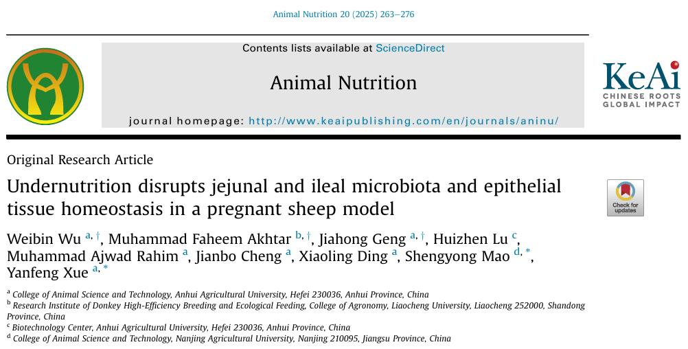 本网讯 公司薛艳锋教授团队在畜牧学领域的中科院一区Top期刊《Animal Nutrition》(IF:7.5)上发表了题为“Undernutrition disrupts jejunal and ileal microbiota and epithelial tissue homeostasis in a pregnant sheep model”的文章。该研究为深入理解反刍动物妊娠期营养不良的肠道生理机制以及制定精准营养干预策略提供了重要的理论基础。