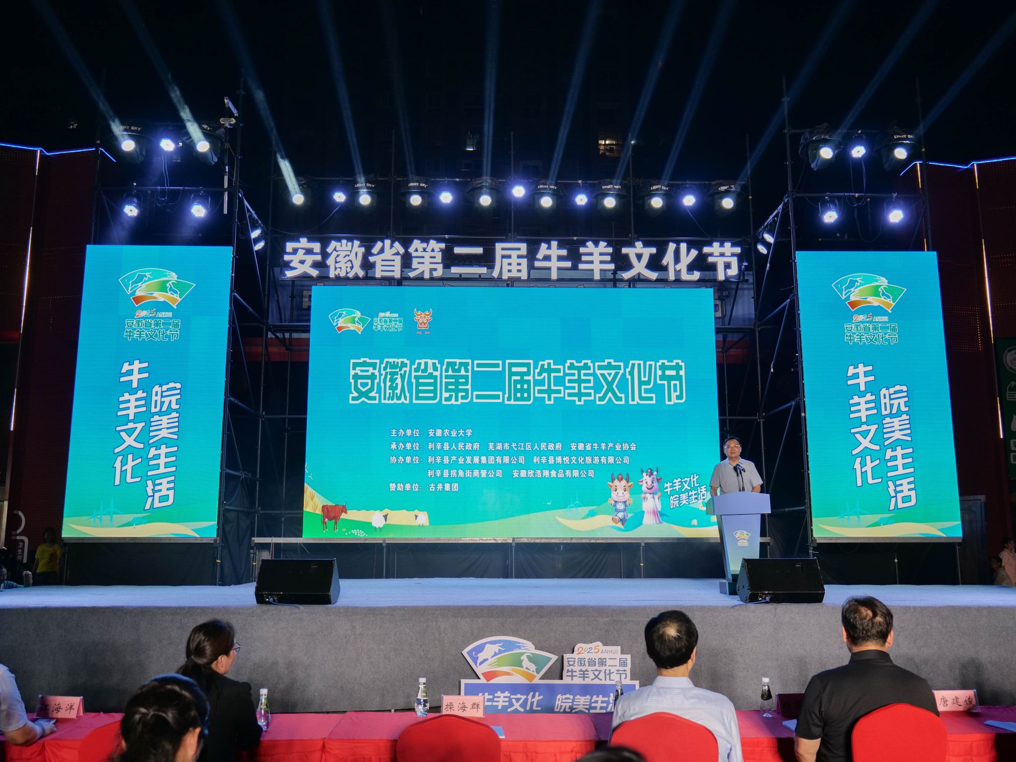 本网讯 8月27日晚,安徽省第二届牛羊文化节在利辛县拐角街隆重开幕。yl1111永利集团党委副书记、董事长操海群,副董事长江海洋,亳州市人民政府副市长刘婉贞,安徽省农业农村厅畜牧兽医局局长王明辉,中国畜牧业协会副秘书长刘强德,中国畜牧业协会牛业分会执行会长唐建俊、安徽省牛羊产业协会会长章孝荣等领导与专家,以及来自全省16个县(市、区)的代表和57家牛羊企业负责人共同出席。