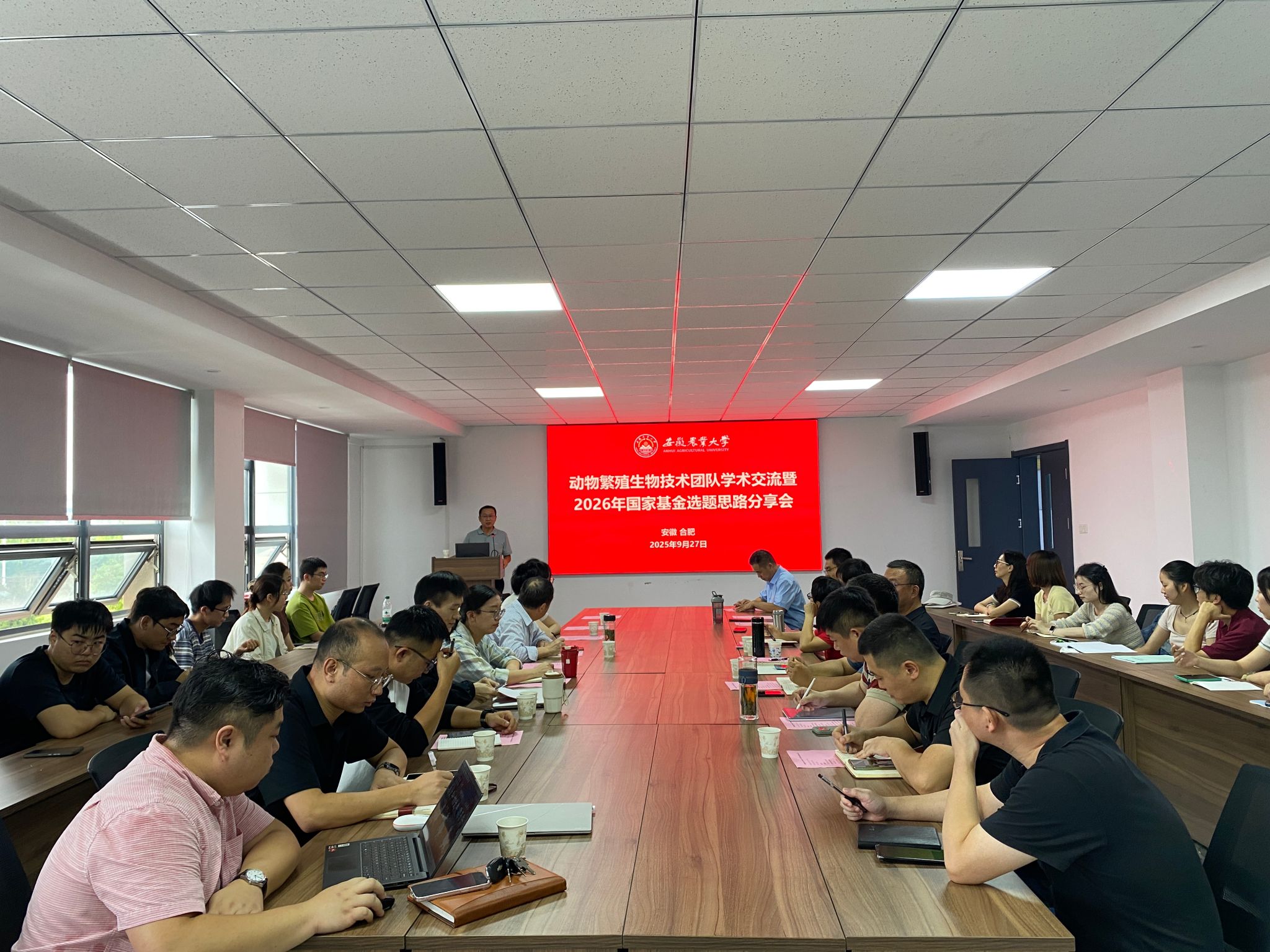 本网讯 聚焦国家自然科学基金申报选题,促进团队学术共进与人才培养。9月27日,学院动物繁殖生物技术团队学术交流暨2026年国家基金选题思路分享会在基因库316会议室举行。章孝荣教授、张运海教授、团队教师及研究生参会,会议由学院副经理曹祖兵主持。