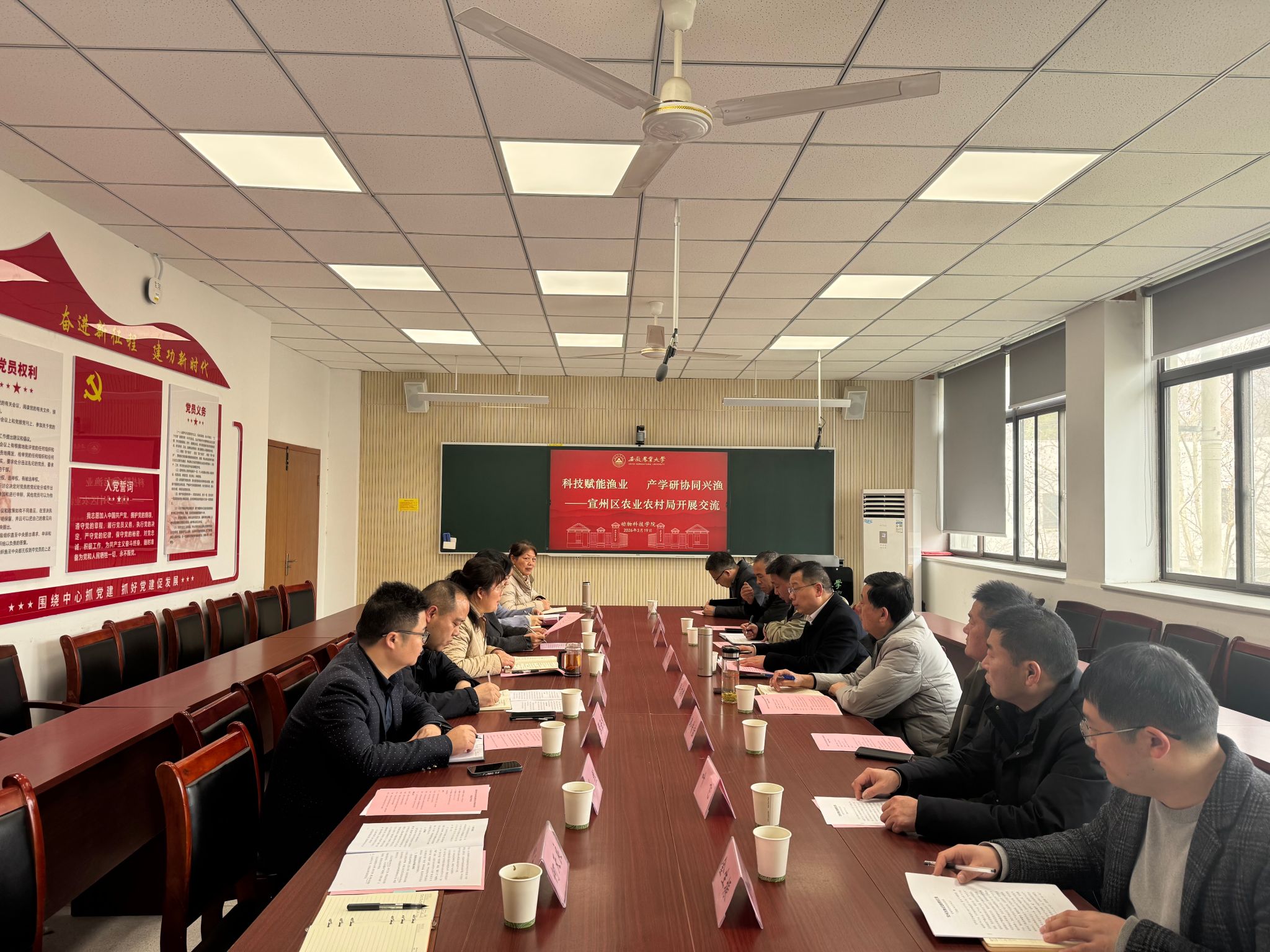 本网讯 3月19日上午,宣州区农业农村局长周飞、副局长吴文彬、宣州区水产技术推广站站长沈蓓杰及相关企业负责人等一行6人到访学院,就深化“1+5”农业科技创新联盟合作,共同推进宣州区水产产业高质量发展进行调研交流。公司党委研究生工作部部长唐红萍、社会合作处副处长单国雷及水产系相关教师参加了会议,会议由公司党委书记沈兆梅主持。