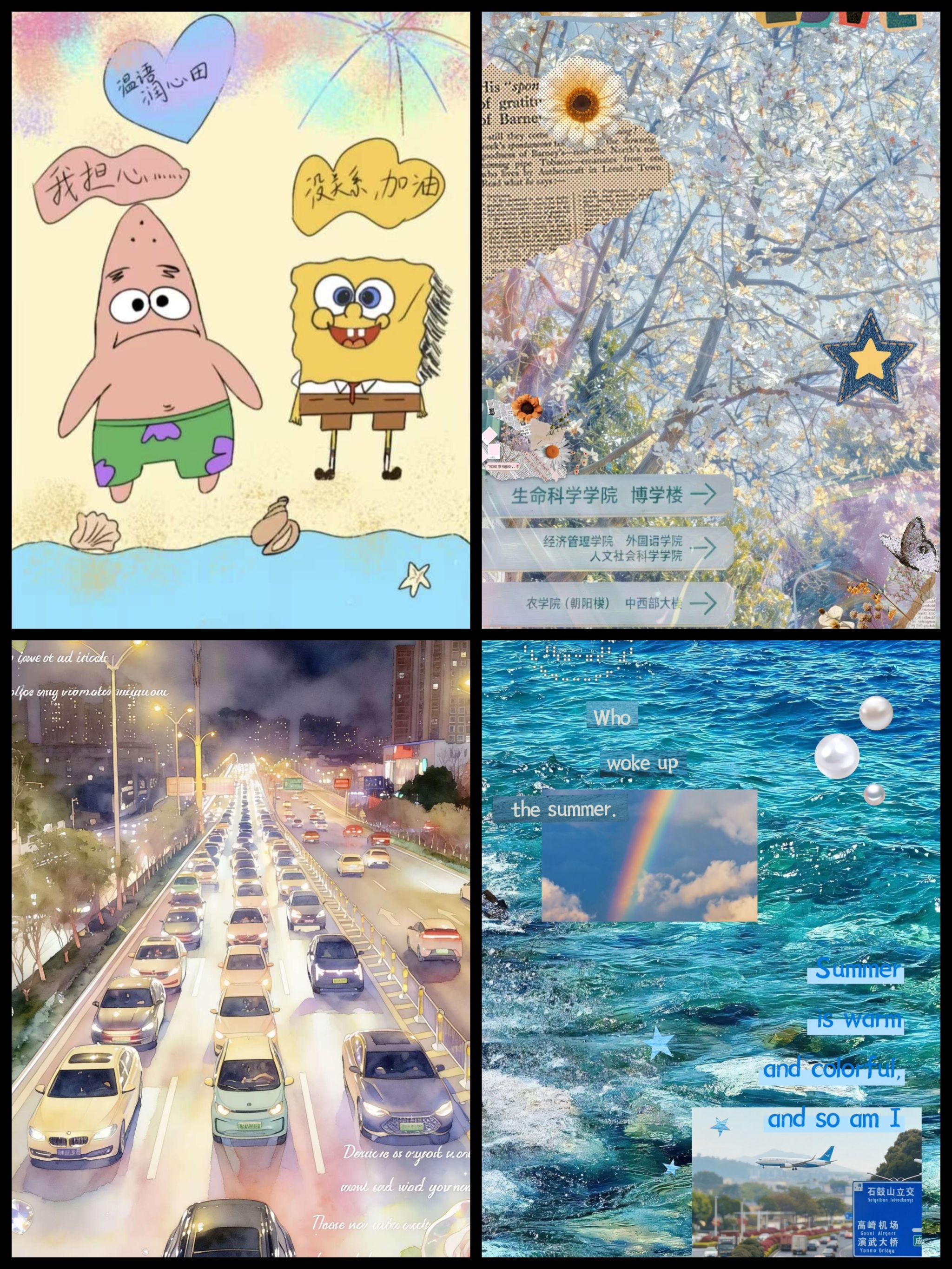 同学们踊跃投稿,作品题材丰富,风格各异。有的以暖黄路灯与晚高峰车流勾勒城市烟火,在喧嚣中传递治愈力量;有的以春日繁花与校园路标拼贴青春浪漫,在光影间记录校园美好;还有的以经典动画角色的暖心对话传递鼓励,用童真治愈心灵焦虑。每一张壁纸不仅是艺术作品,更是同学们内心情感的真诚流露,是赠予自己与他人最温暖的心灵礼物。