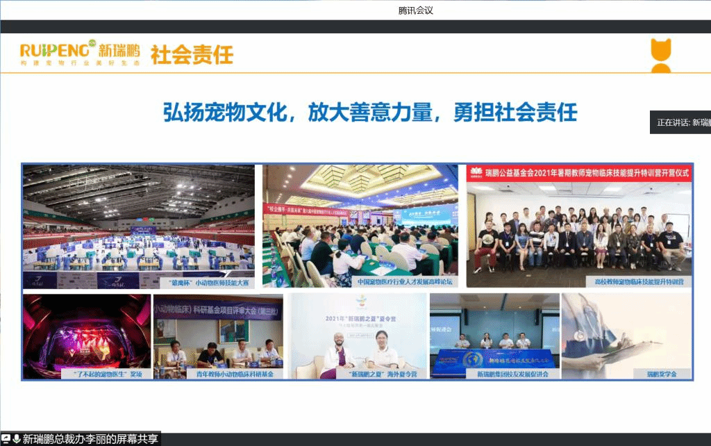 李丽在报告中围绕着国内外宠物行业现状、宠物行业企业建设实例、职业生涯规划设计、行业发展与人才培养的困境以及动物医学人才培养探索实践等方面深入分析了当今宠物医疗行业的发展。演讲中,李丽用生动感人的故事、诙谐幽默的语言吸引和打动了每一位员工。期间,瑞鹏宠物医疗集团还邀请了部分优秀员工分享自己的职业规划和求职经历。演讲结束后,李丽就同学们对宠物诊疗行业未来发展存在的疑惑、对未来从事该专业工作存在的迷茫进行了线上互动交流。