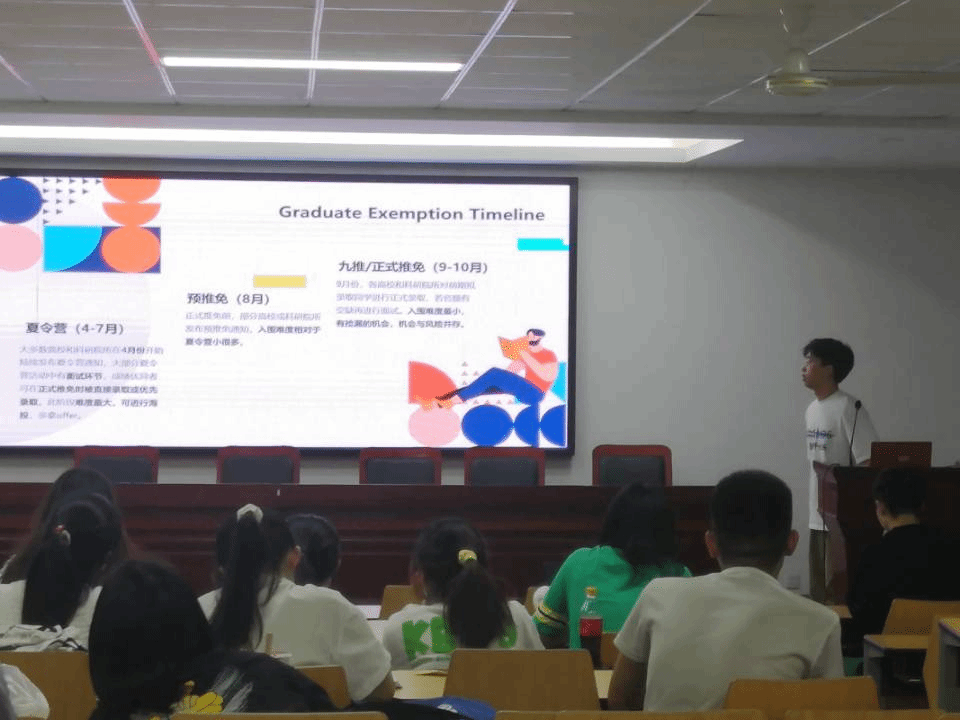 在保研经验分享的环节,李超越、何志勇借助自身经历讲述了面试时可能遇到的问题及应对办法,告诫同学们要扎实专业知识,对面试进行有针对性的准备。钟富超分享了保研准备过程中的注意事项,如熟悉科研经历中所有可能涉及到的专业知识点等,并对简历的制作进行了简要介绍。单爱婷介绍了部分大学夏令营的考核方式及氛围,建议同学们保持心态平稳。最后杨佳雨就保研的时间规划、目标定位、院校选择及复试准备提供了宝贵意见。