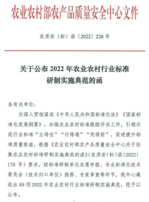 农业行业标准实施典范的发布,是农业农村部为加快推进农业高质量发展、构建行业标准体系、树立行业标准质量标杆而推行的一项重要举措。经过行业标准编制单位自愿申报、专业标准化技术委员会推荐、专家审查等流程,遴选出89项高质量标准入选农业农村行业标准研制实施典范,并开展集中宣展。