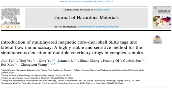 本网讯:近日,公司安徽省动物性食品质量与生物安全工程实验室与军事医学研究院等单位合作,在学术期刊《Journal of Hazardous Materials》上发表了题为“Introduction of multilayered magnetic core–dual shell SERS tags into lateral flow immunoassay: A highly stable and sensitive method for the simultaneous detection of multiple veterinary drugs in complex samples”(中科院一区top,IF:14.224)的研究论文。
