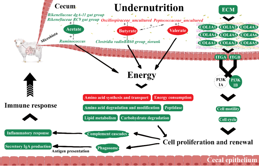 营养不良在动物生产中很常见,尤其是在雌性动物的妊娠期和哺乳期。营养不良不仅会诱发代谢性疾病,威胁母体的健康,还会抑制胎儿的生长发育。盲肠在后肠发酵中发挥重要作用,为机体提供挥发性脂肪酸和微生物蛋白。肠道上皮组织在机体的营养吸收与运输、屏障功能和免疫功能等方面发挥重要作用。但是,人们对营养不良时盲肠微生物群和上皮细胞之间的相互作用却知之甚少。该研究结果表明,营养不良会影响盲肠微生物的结构和功能,从而改变盲肠发酵模式,影响盲肠上皮的物质转运和代谢,并通过抑制细胞外基质-受体相互作用,经PI3K 信号通路影响上皮细胞中的生物学进程,破坏盲肠上皮形态、降低盲肠重量,而且影响盲肠上皮中的免疫应答过程。这些发现将有助于进一步探索微生物与宿主的互作机制。