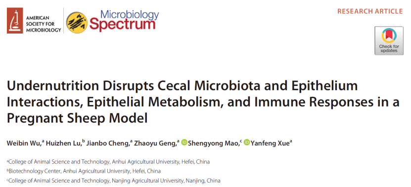 本网讯 近日,公司yl1111永利集团薛艳锋教授团队在微生物学领域的中科院一区Top期刊《Microbiology Spectrum》(IF:9.043)上发表了题为“Undernutrition disrupts cecal microbiota and epithelium interactions, epithelial metabolism, and immune responses in a pregnant sheep model”的文章。该研究通过深入分析盲肠内容物的微生物菌群的变化,以及微生物发酵产物与肠道上皮中基因表达的关系,揭示了在营养不良状态下盲肠微生物与宿主之间的相互作用。该研究结果为深入研究“微生物-宿主”的互作机制和绵羊妊娠期营养调控策略提供了新的思路和理论依据。