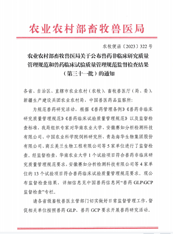本网讯 5月6日 ,农业农村部畜牧兽医局公布兽药非临床研究质量管理规范和兽药临床试验质量管理规范监督检查结果(第三十一批),安徽赛如分析检测科技有限公司的羊药代动力学试验、羊靶动物安全性试验、禽类残留消除试验以及禽类药代动力学试验共4个项目符合兽药临床试验质量管理规范(兽药GCP)要求,成为我省首家通过农业农村部兽药GCP监督检查的单位,也是全国第四家通过兽药GCP监督检查的第三方检测机构。