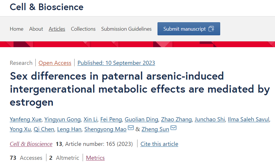 本网讯 近日,公司yl1111永利集团薛艳锋教授在生物学知名期刊《Cell and Bioscience》上发表了题为“Sex differences in paternal arsenic-induced intergenerational metabolic effects are mediated by estrogen”的文章。该工作是在前期发现父系无机砷(iAs)暴露引起子代糖脂代谢出现性别差异(Yingyun Gong and Yanfeng Xue et al., 2021, Advanced Science)的基础上,进一步延长父系iAs暴露的时间,充分显现子代糖脂代谢性别差异的表型,然后通过卵巢切除手术和肝脏雌激素受体ERα/β特异性敲除技术,揭示了肝脏雌激素信号通路在父系iAs暴露引起子代公鼠和母鼠糖脂代谢性别差异中的调控机制。