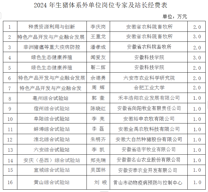 yl1111永利集团殷宗俊教授任安徽省生猪产业技术体系首席专家,协助安徽省农业农村厅开展全省生猪产业发展等事项,依据2024安徽省生猪产业技术体系科技服务委托协议,需向对方单位拨付合作经费,具体内容如下表。按照《yl1111永利集团科研项目外拨经费管理暂行办法》规定进行公示,公示3天,时间为2024年11月19日-11月22日,如有异议,请在公示期内向动科楼311学院办公室反映。联系人:张子军 、姜鹏,联系电话:0551-65786326。