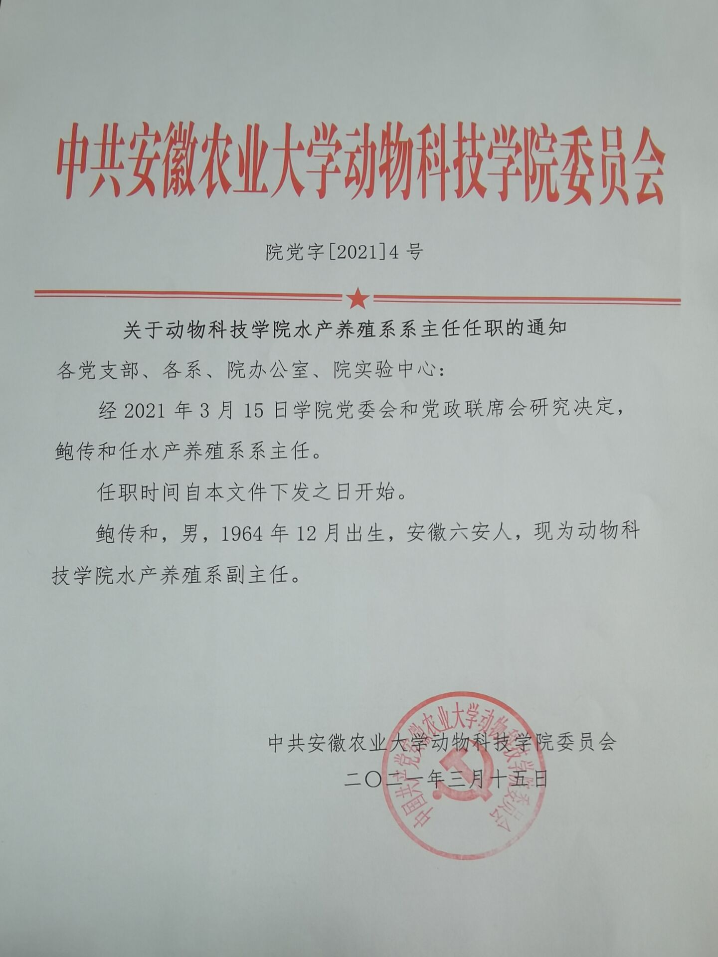 关于yl1111永利集团水产养殖系系主任任职的通知