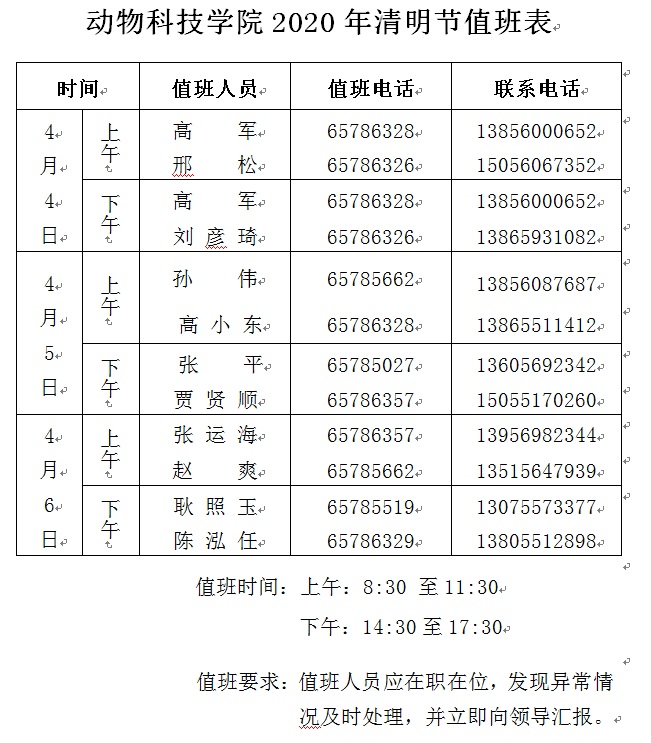 动科院2020年清明节值班表