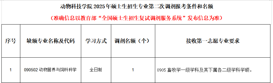 公司动物营养与饲料科学学硕专业调剂系统第二次开放时间为2025年4月11日9时,系统关闭时间根据生源情况确定,欢迎全国各地优秀考生调剂到公司继续深造。