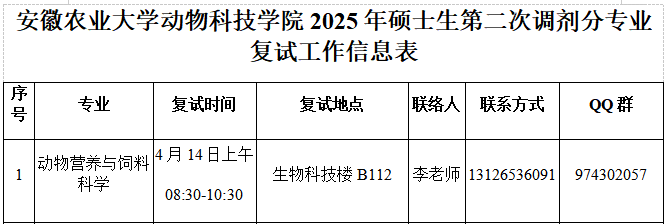 yl1111永利集团2025年硕士研究生第二次调剂分专业复试工作信息表(动物营养与饲料科学专业)