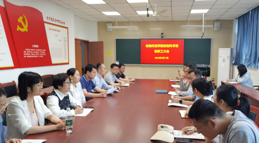 曹祖兵通报了动物科学系研究生导师招生资格审核、开题与中期考核、学位论文盲审、学位论文抽查、论文答辩安排、就业以及2024版本科人才培养方案修订等方面的情况及近期工作安排。张成通报了动物科学系本科公司产品审核评估、一流专业建设、本科毕业实习、本科毕业论文答辩等方面的开展情况及近期工作安排。动物科学系教工党支部书记朱雯通报了近期支部的工作情况。