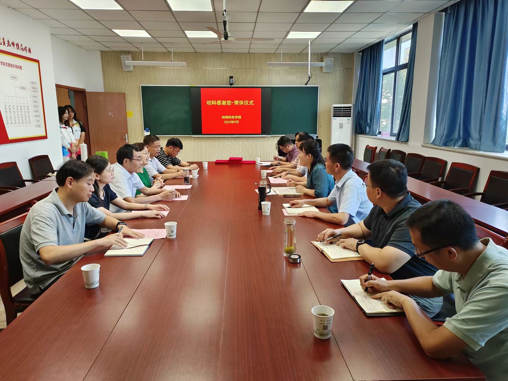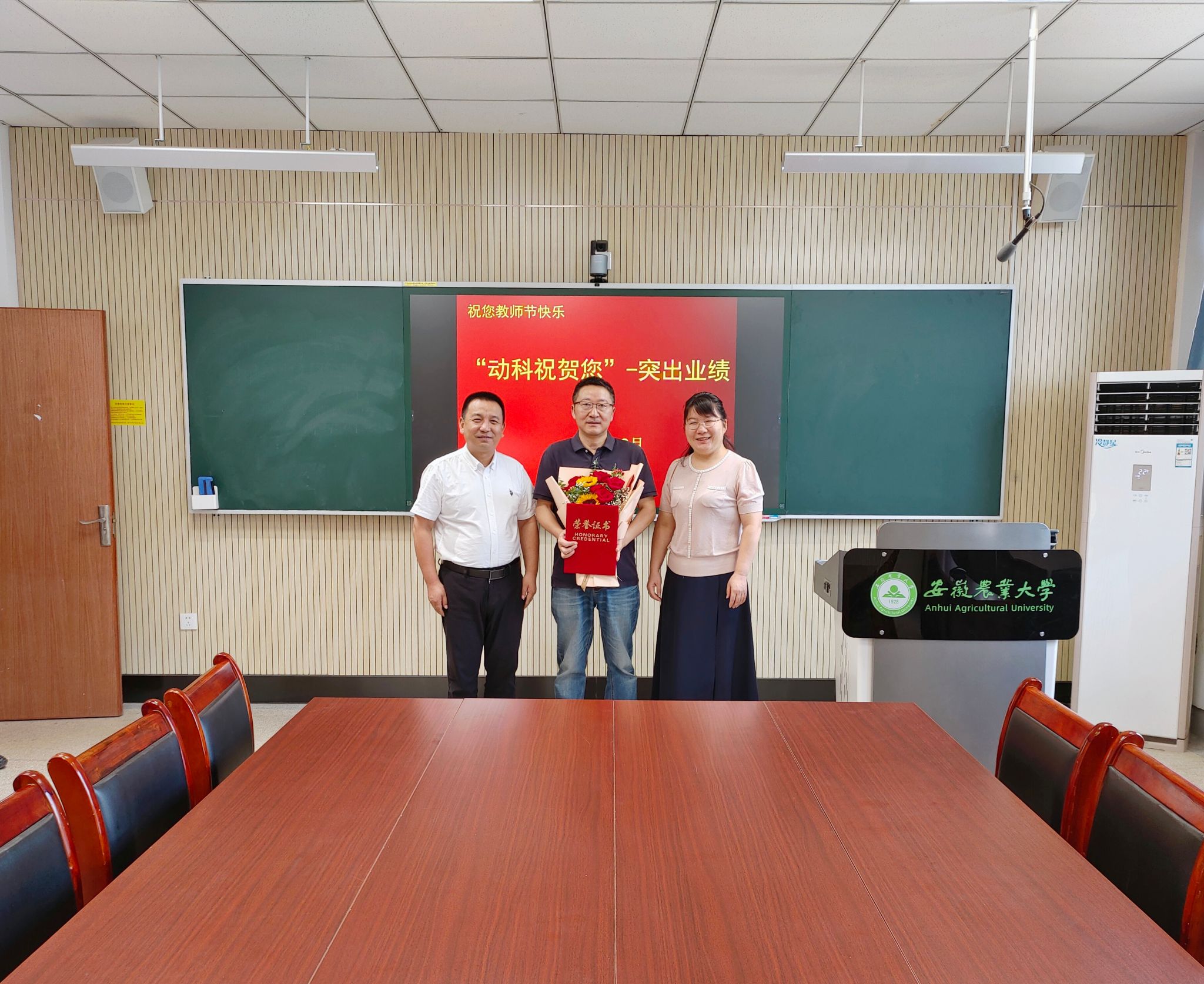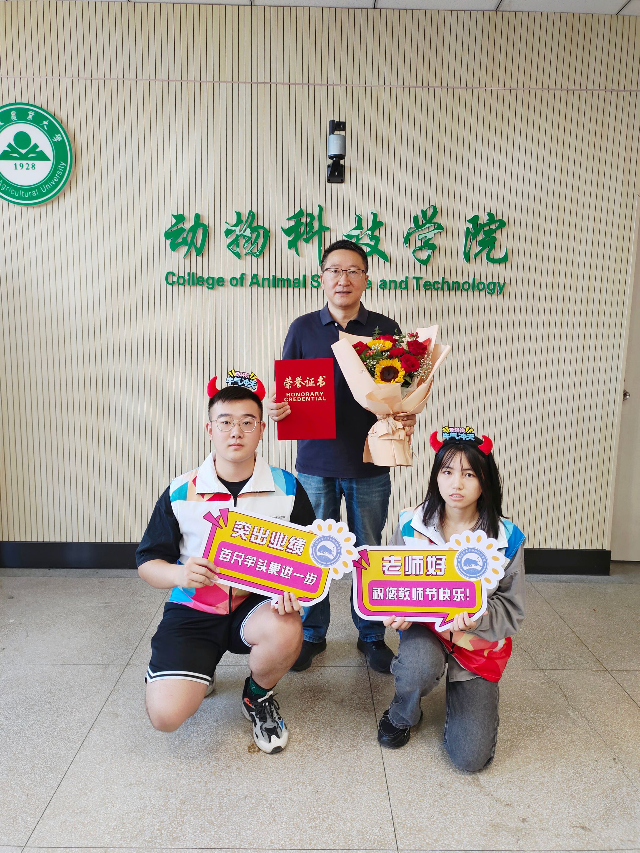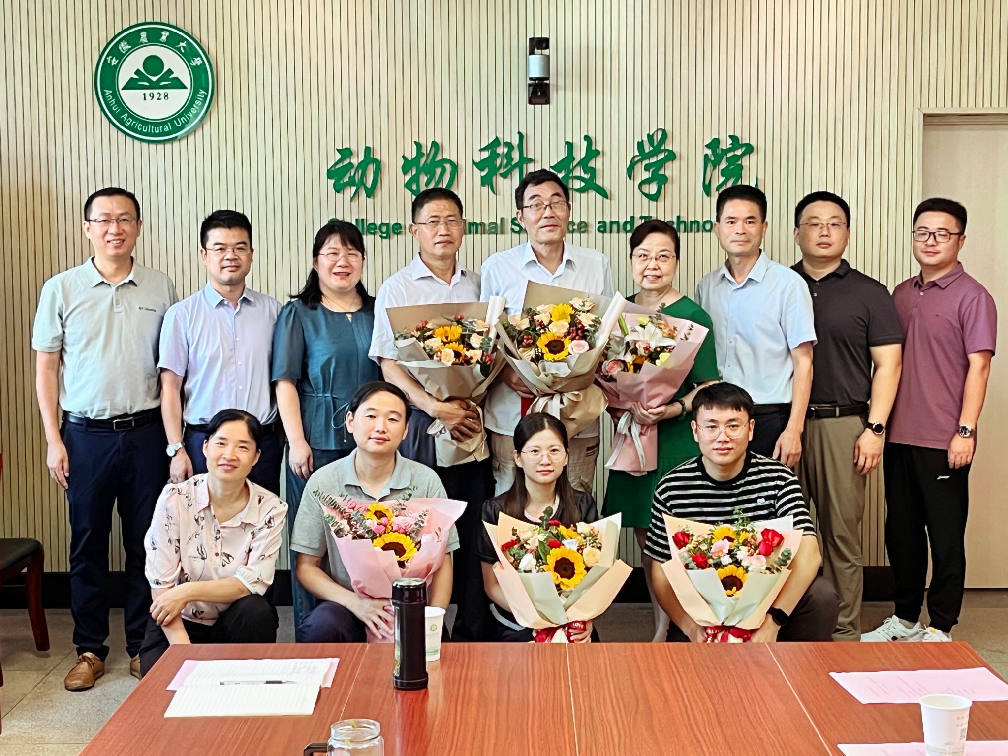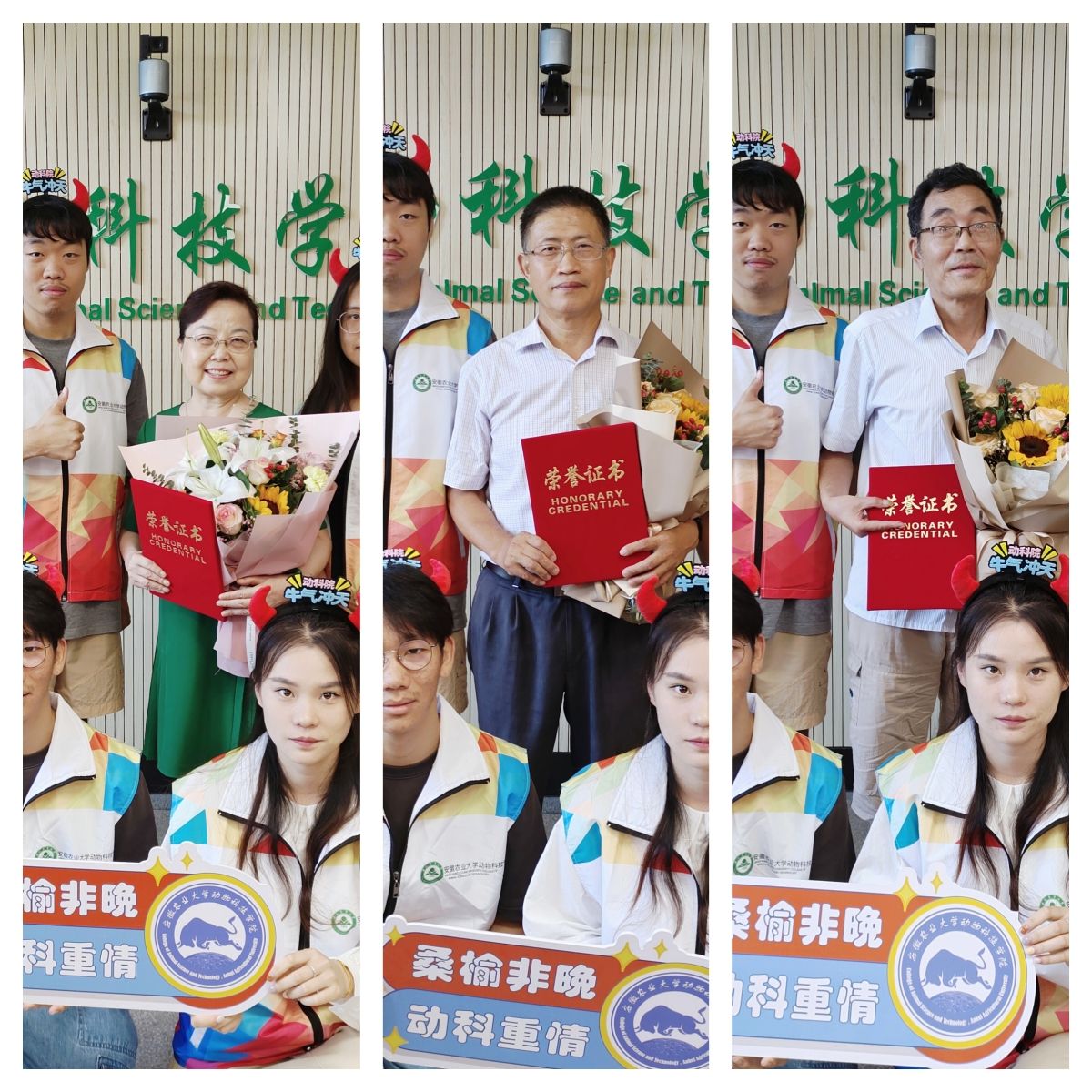仪式最后,学院领导为退休教师颁发了“动科感谢您-荣誉证书”,新进教师献花并合影留念。
