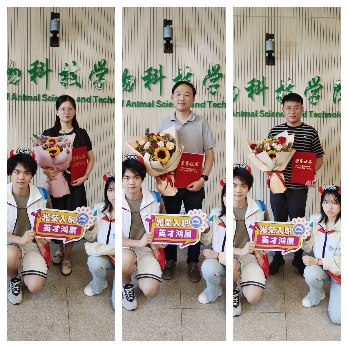在“动科欢迎您-光荣入职”活动中,学院领导班子、系部主任和教师代表参加了活动,对新进教师的入职表示欢迎,同时希望他们尽快转变角色、融入团队、找准定位,在未来工作中英才得展,大展宏图,百尺竿头更进一步。 活动最后志愿者献花并合影留念。