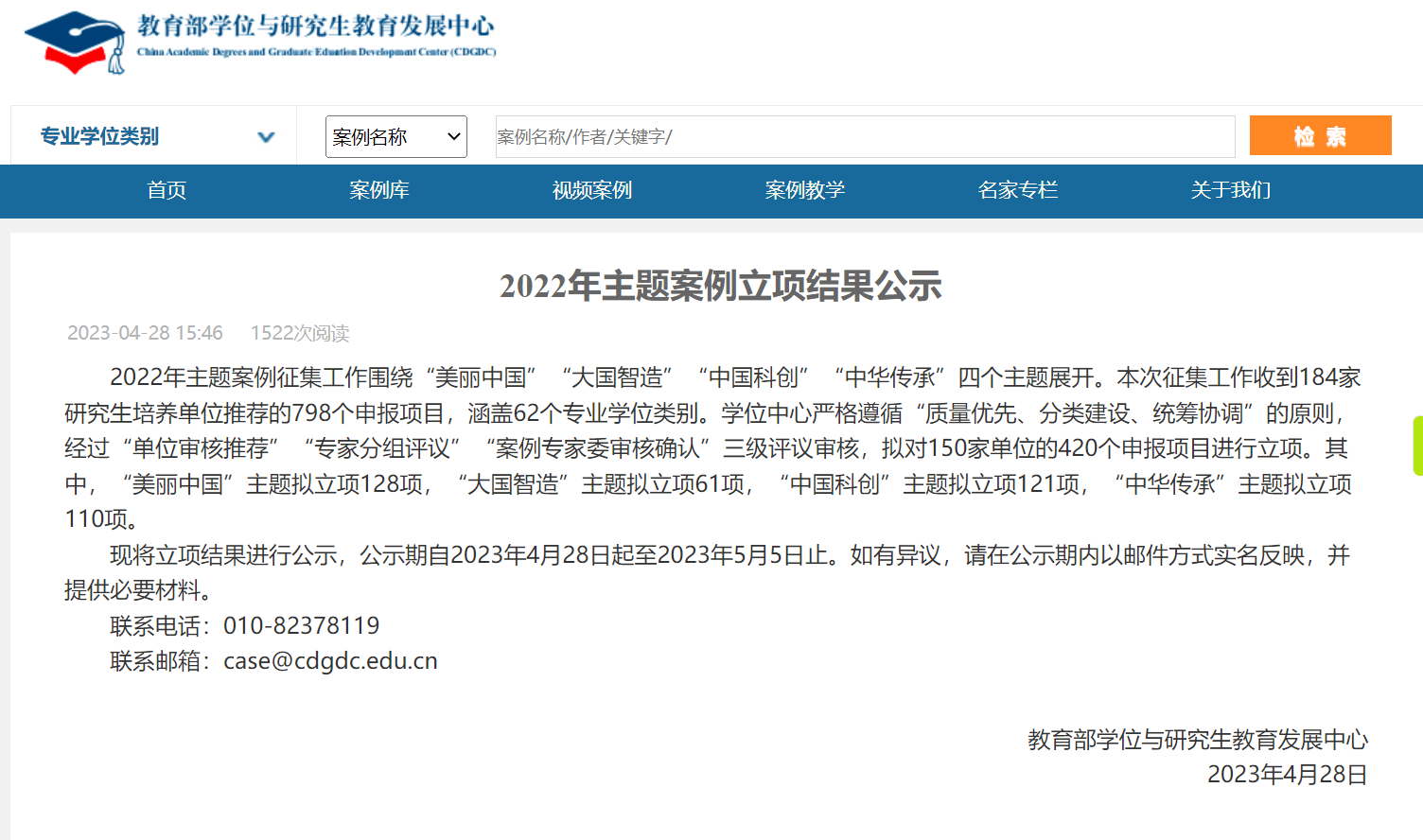 2022年主题案例征集工作围绕“美丽中国”“大国智造”“中国科创”“中华传承”四个主题展开。学位中心严格遵循“质量优先、分类建设、统筹协调”的原则,经过“单位审核推荐”“专家分组评议”“案例专家委审核确认”三级评议审核,共对150家单位共420个申报项目进行立项。其中,“美丽中国”主题立项128项,“大国智造”主题立项61项,“中国科创”主题立项121项,“中华传承”主题立项110项。