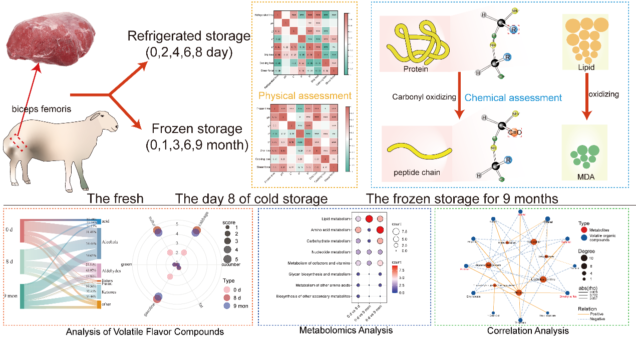 研究团队利用湖羊股二头肌在冷藏冷冻模式下的肉质性状数据、蛋白质氧化及脂质氧化参数、GC-IMS快速检测肉质中风味物质的变化技术及代谢组学技术,发现湖羊股二头肌在冷链模式下风味和代谢物的变化存在紧密联系。在脂质和蛋白质的强烈氧化作用下,长时间的冷藏或冷冻会显著降低肉的品质。在此过程中,己醛和二甲基硫醚被确定为导致肉类风味显著变化的关键挥发物质。此外,差异代谢物在冷藏储存期间富集氨基酸代谢,而在冷冻储存期间则富集脂质代谢,并与关键挥发物质呈现显著的相关性。此项研究通过全面评估不同冷链条件下羊肉的品质和风味变化,为优化羊肉冷链储存和运输策略提供了重要依据,对进一步提高羊肉产品的新鲜度和风味特性具有重要的启示意义。