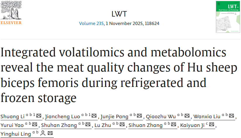 本网讯公司凌英会教授课题组在《LWT - Food Science and Technology》(中科院1区 TOP期刊)上发表了题为《Integrated volatilomics and metabolomics reveal the meat quality changes of Hu sheep biceps femoris during refrigerated and frozen storage》的研究论文。该研究揭示了湖羊股二头肌在冷藏冷冻模式期间的肉质变化。