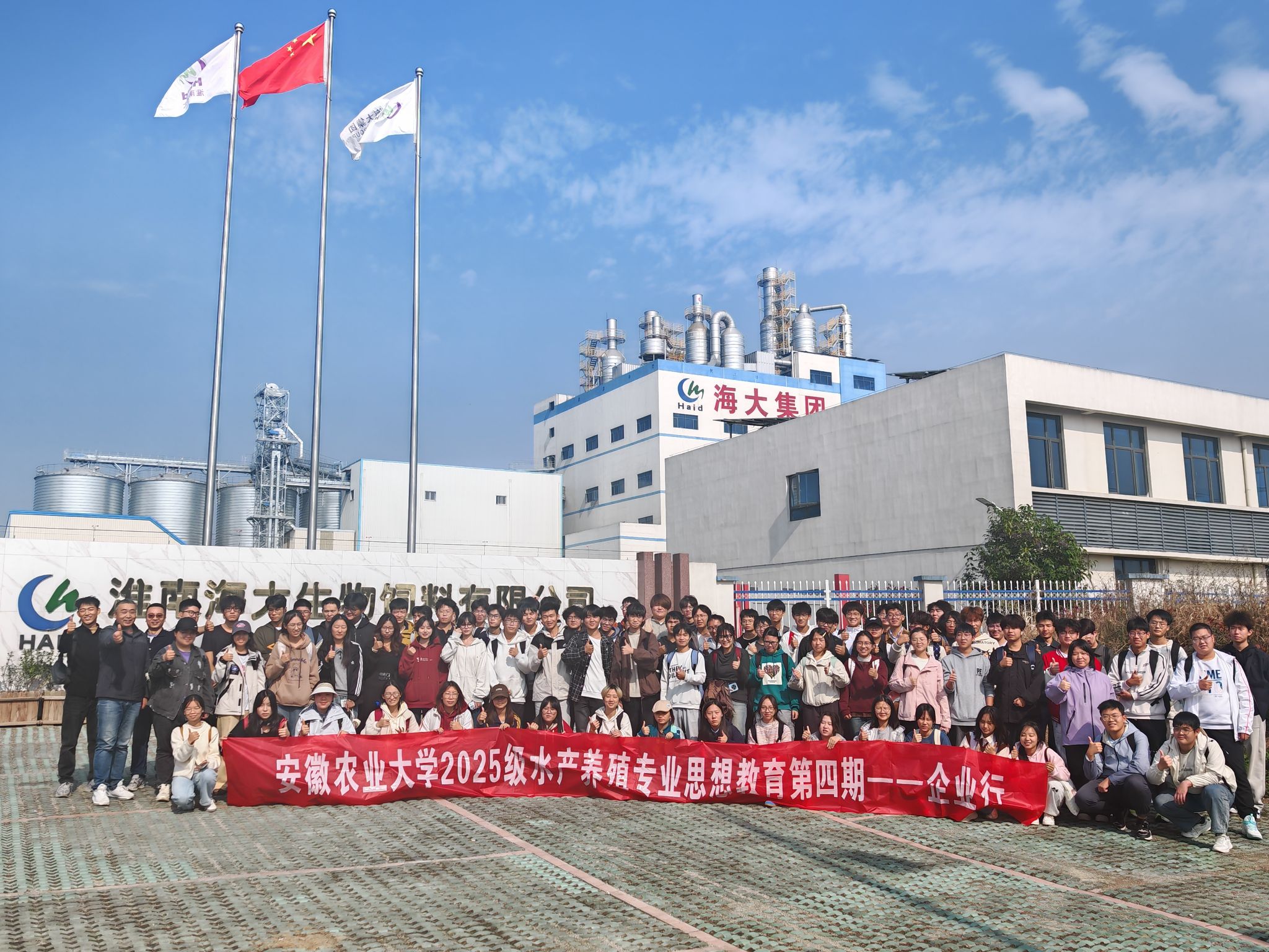 随后,师生一行前往淮南海大生物饲料有限公司。2010级员工王辉作为企业代表,介绍了公司发展历程、核心产品及行业影响力,并带领大家走进生产车间,近距离参观饲料全流程生产线,帮助新生明晰专业应用场景。