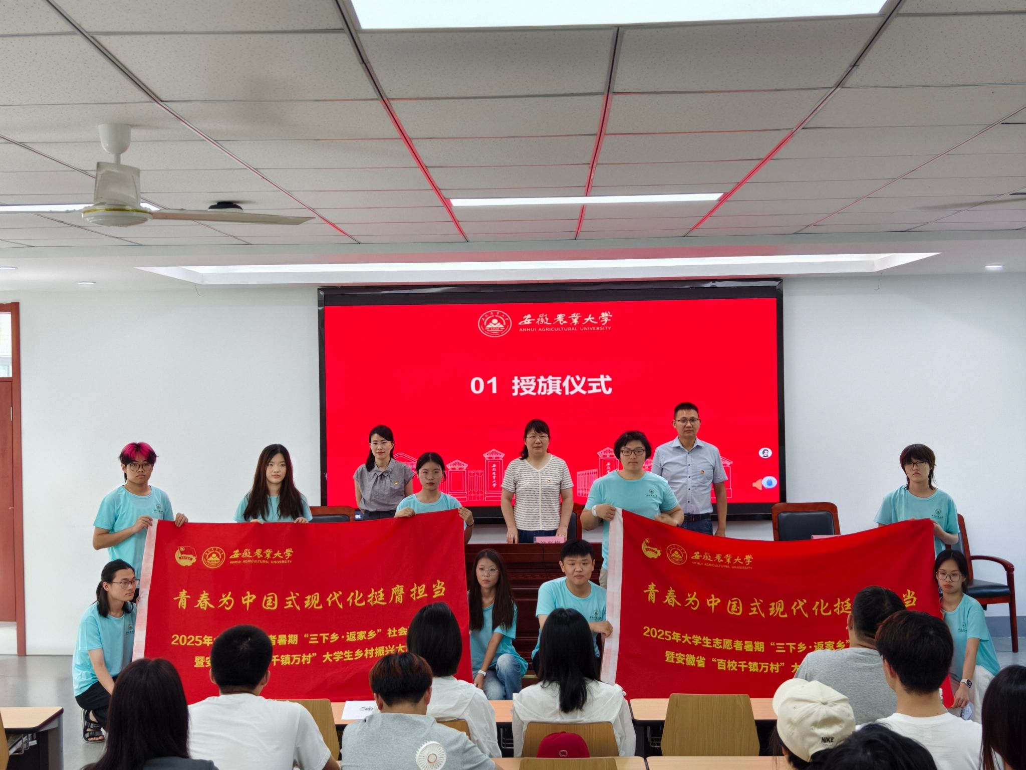 仪式在激昂的氛围中拉开帷幕。学院领导为即将出征的暑期“三下乡”社会实践团队代表郑重授旗。鲜红的旗帜不仅象征着方向与责任,更承载着学院对学子深入基层、服务社会的殷切期望。接过旗帜,意味着接过了在广阔天地中展现动科风采、贡献青春力量的光荣使命。
