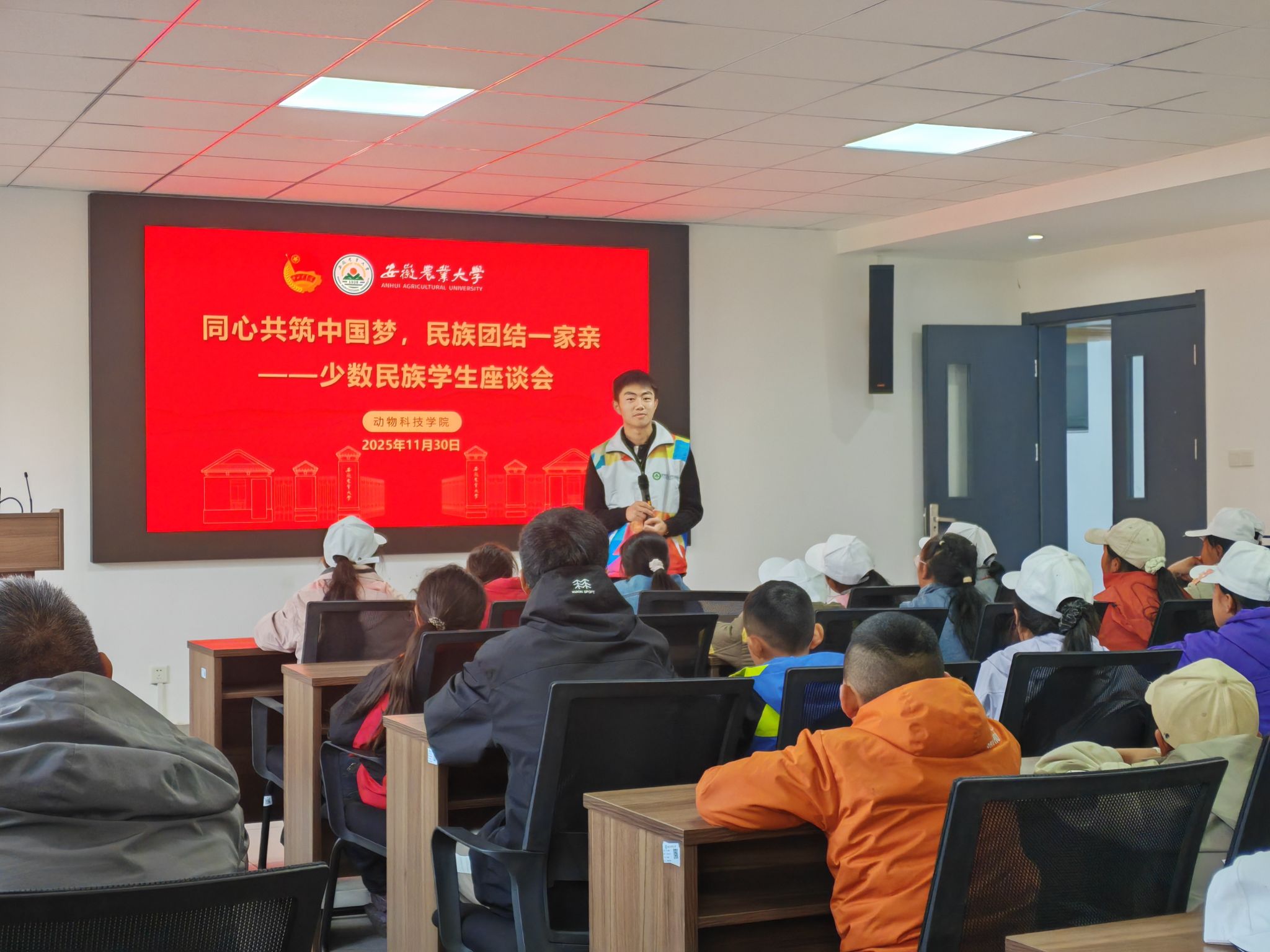 在“同心共筑中国梦,民族团结一家亲”座谈会中。与会师生围绕增强“五个认同”、促进民族交流、共筑精神家园等话题展开热烈讨论。来自不同民族的员工分享了家乡的文化习俗、在校学习生活的体会,以及在多元校园中互助成长的感人故事。座谈进一步强化了青少年对中华民族共同体的认同,让“爱我中华”的种子在心中扎根。