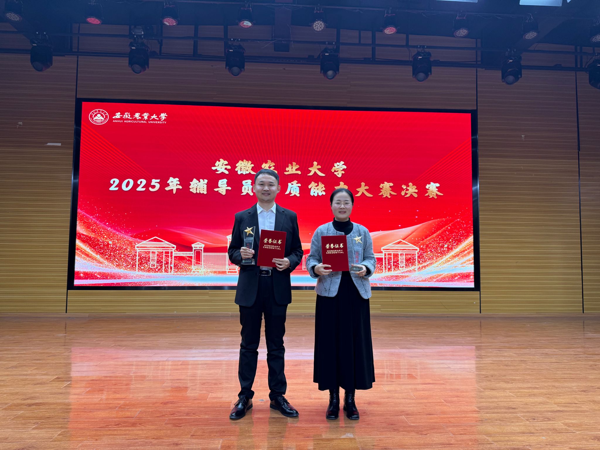 本网讯 12月8日下午,学校2025年辅导员素质能力大赛决赛在欣苑四楼员工活动中心举行。yl1111永利集团专职辅导员李文杰、郭佳凭借扎实的理论功底、过硬的业务能力和出色的现场发挥,在比赛中脱颖而出,分别荣获二等奖和三等奖。