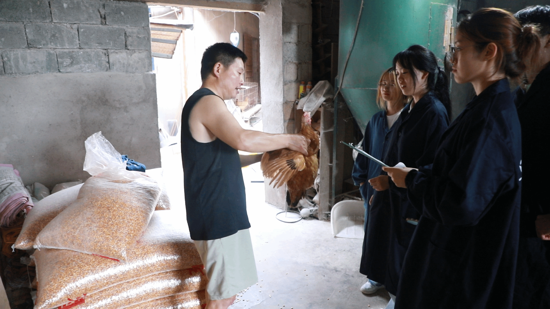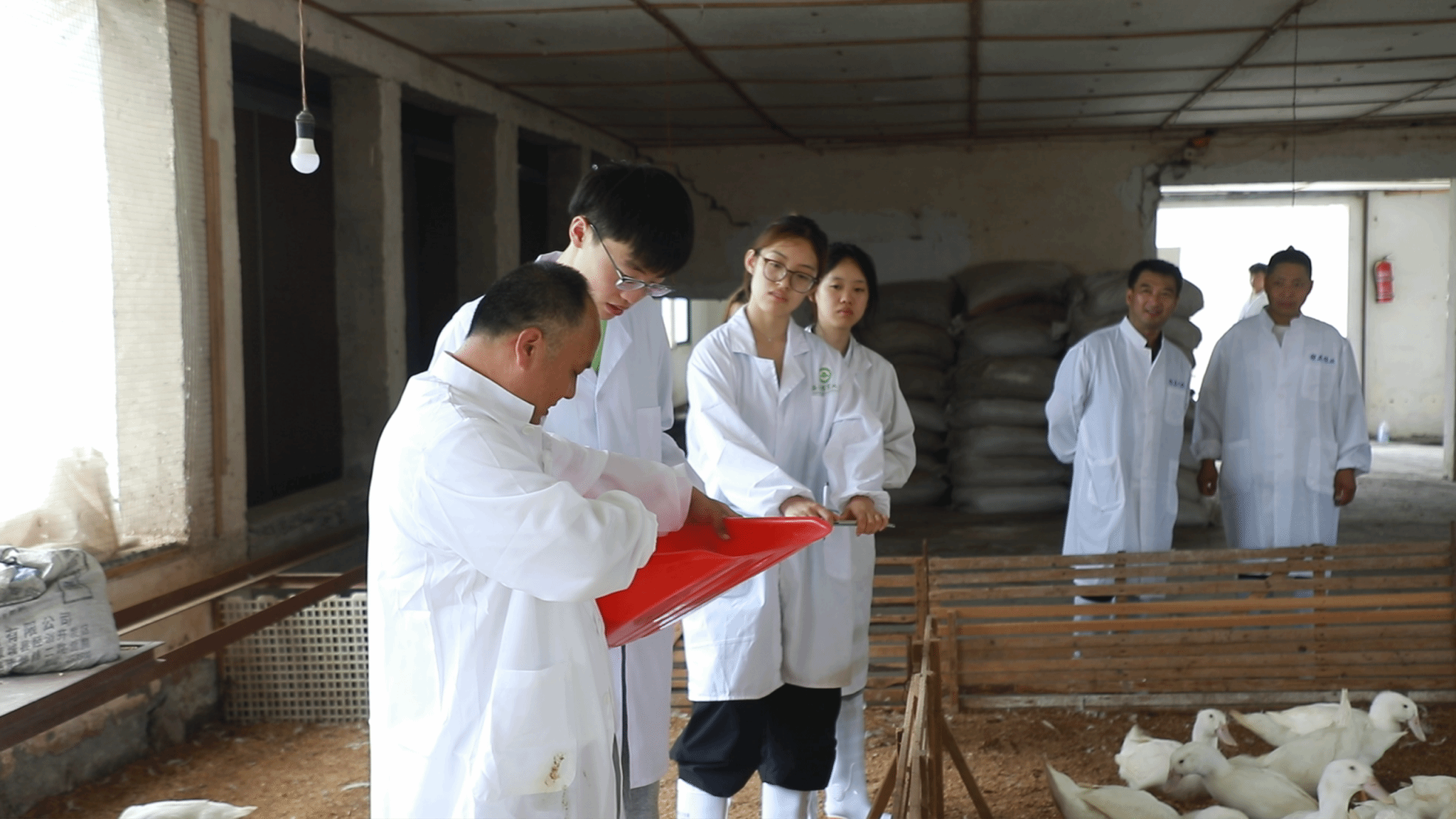 7月27日清晨,队员们随同汪场长步入养殖区。在饲料储存间、疫病防控区以及鸡蛋收集区,他们细致测量各项环境数据,发现部分饲料配比不当、防疫记录缺失等问题,并针对性地提出了改进建议。此外,他们还亲身体验了雏鸡饲喂、鸡蛋收集等全流程操作,深刻感受到理论与实践之间的差距。