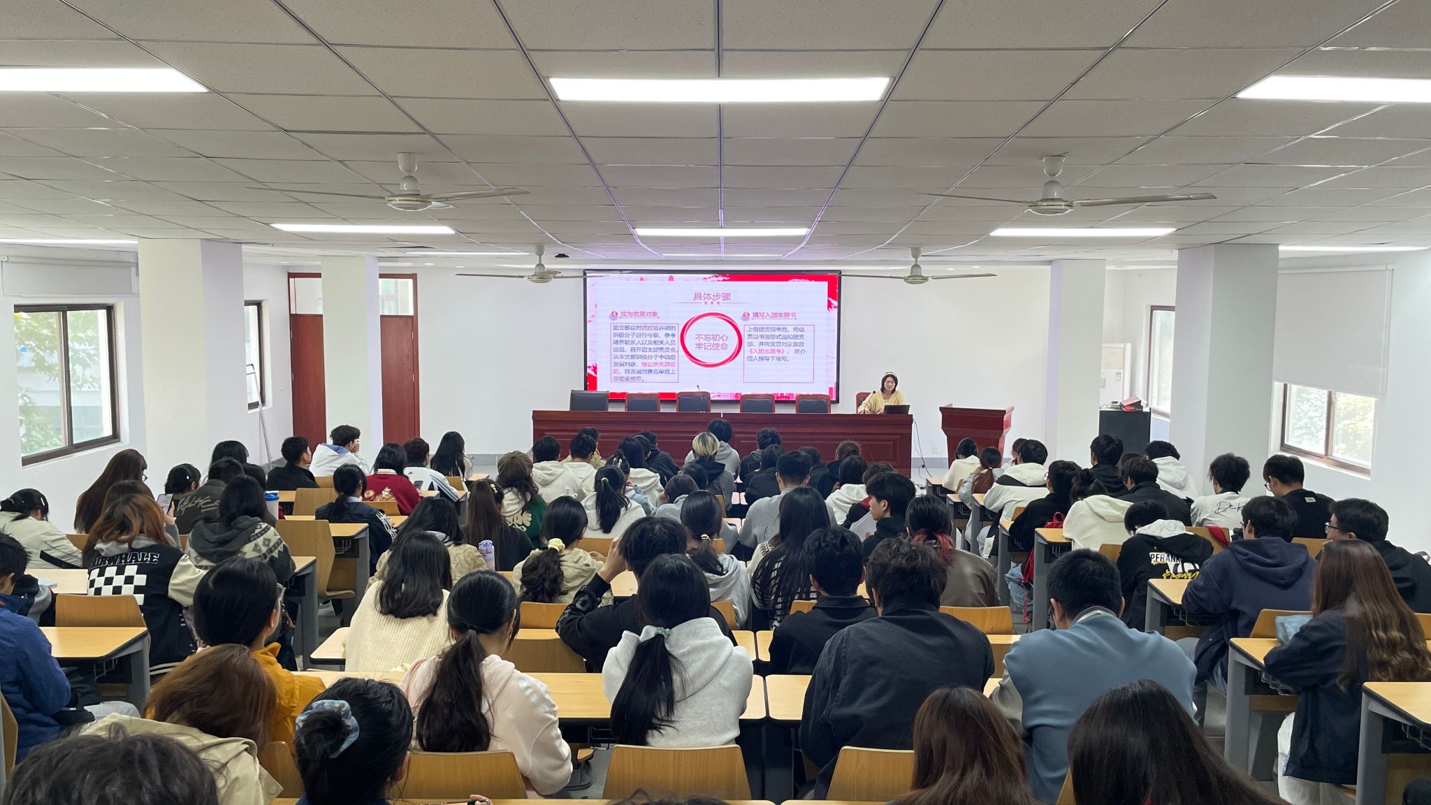 2022级动物科学专业员工党员张灵霜同志围绕党团发展历程与发展程序等内容作主题宣讲。她结合学习与实践经验,系统介绍了党团组织的光辉历程与规范程序,引导在场同学进一步增强对党团组织的认同感与归属感。