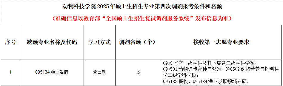 公司渔业发展专硕调剂系统第四次开放时间为2025年4月16日22:00,系统关闭时间根据生源情况确定,欢迎全国各地优秀考生调剂到公司继续深造。